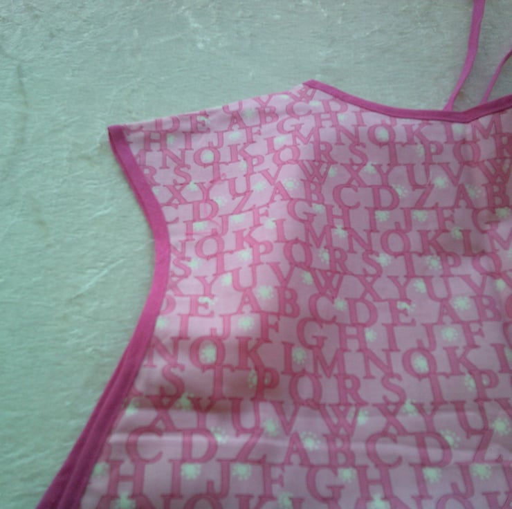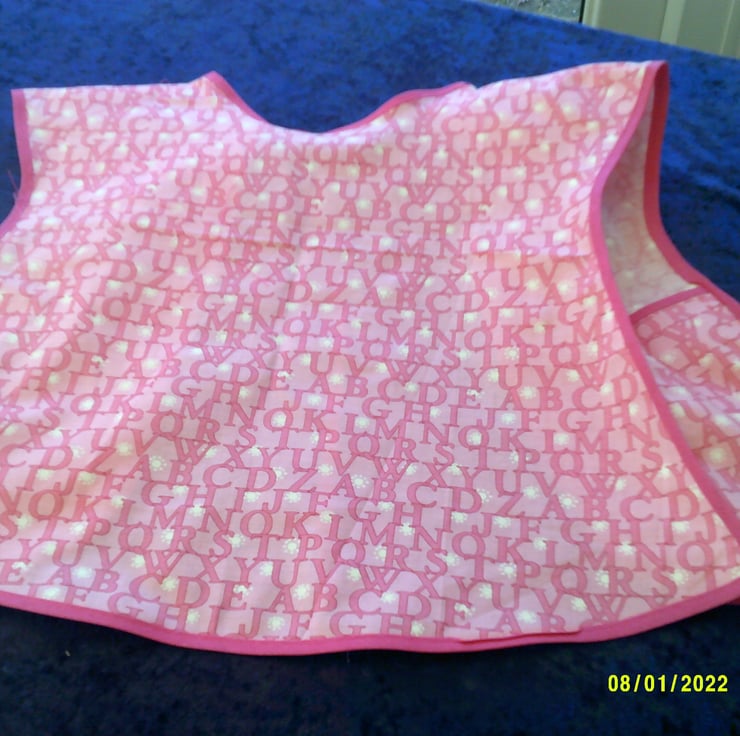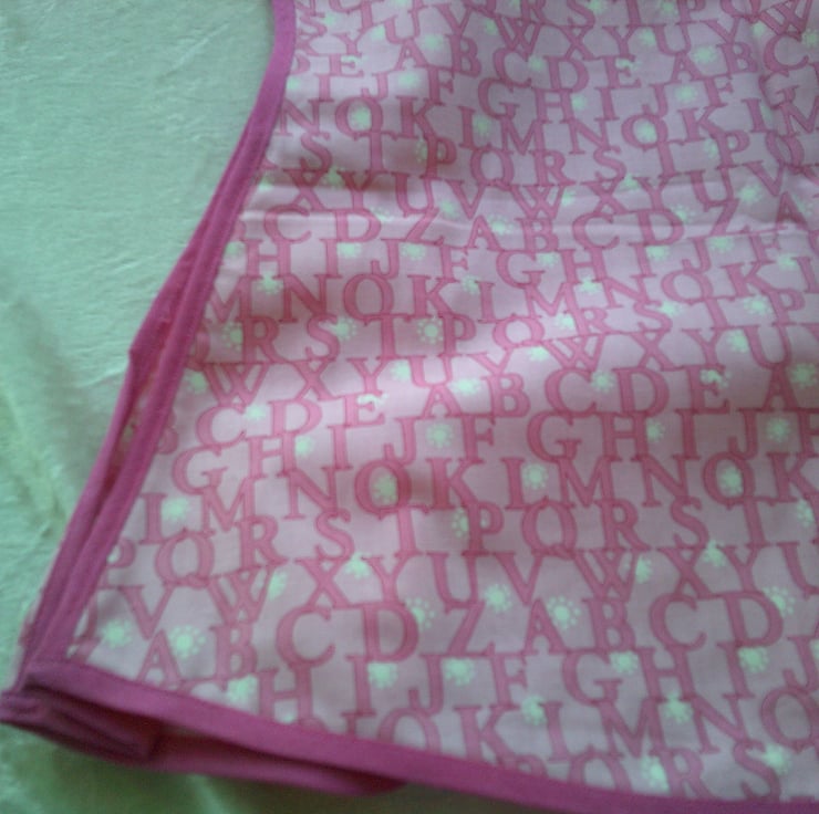 The fabric used is of letters of the alphabet on a pink background and is edged with pink bias binding.