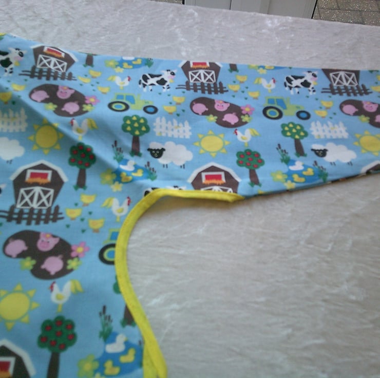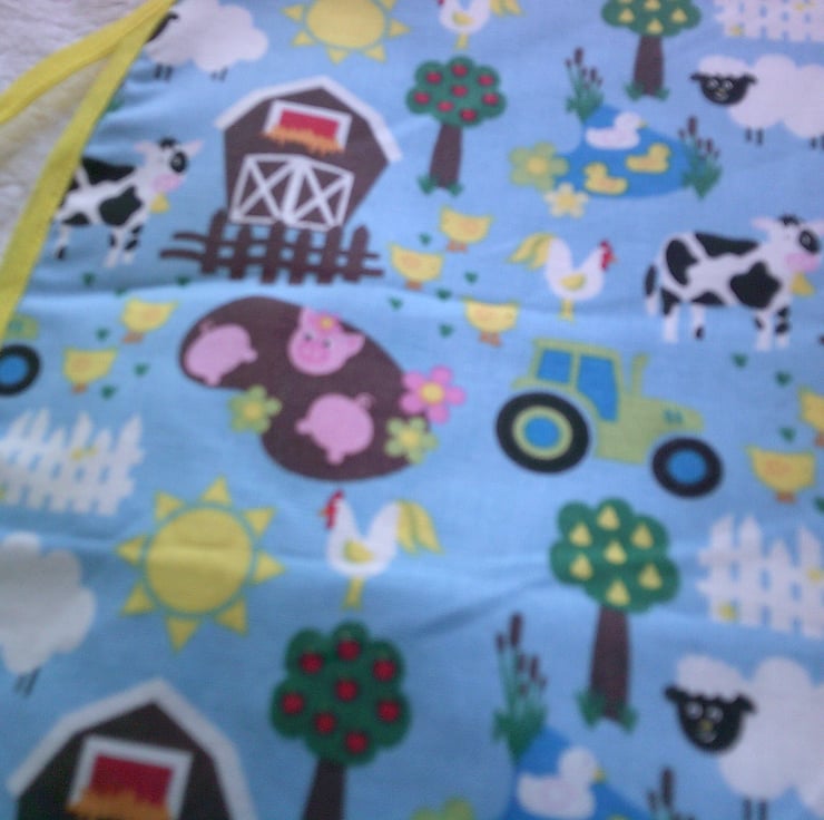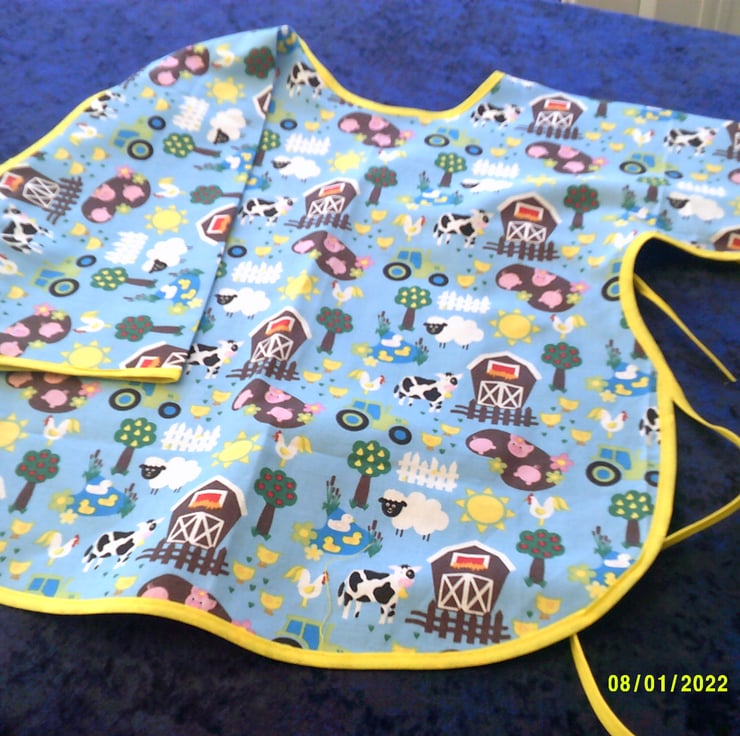 The design of the fabric used is of a farmyard with a variety of animals including pigs, sheep, cows, chickens and ducks along with farm buildings on a blue background and edged with yellow Bias Binding