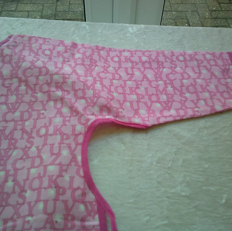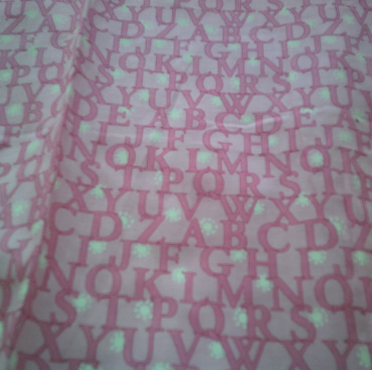 The fabric used is of letters of the alphabet on a pink pink background with a contrasting edging of bright pink Bias Binding