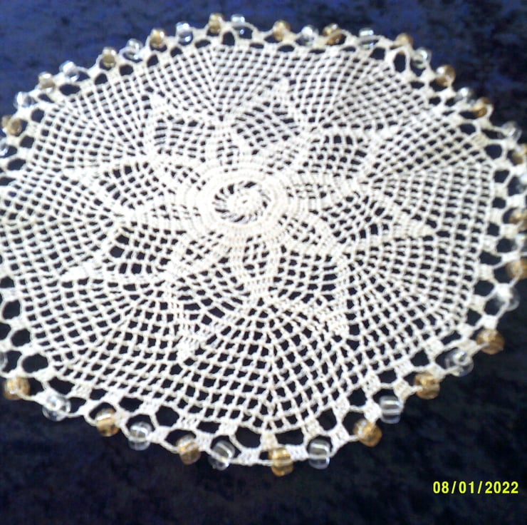The design is of what looks like an open work large flower within treble crochet with chain loops around the edge - the design is called Amber and measures approximately16.5cm in diameter.