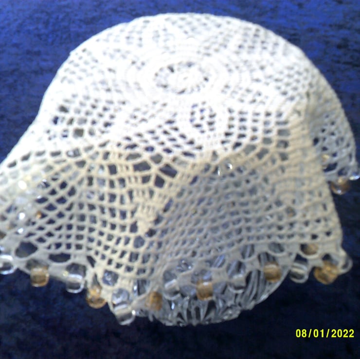 This crocheted Jug Cover or Bowl cover is made using fine crochet cotton in white with Sparkly Gold and Clear beads around the edge to keep it "weighted" down over your jug or sugar bowl / small bowl of salad when you are dining alfresco.