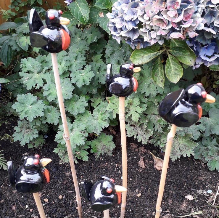 Cane Tops for your garden. Made from red earthenware clay, all glazed to suit the subject! Last for years and years in all weathers in your garden. I love Robins such individual characters and this set of 5 Robins is my personal take on them. I use a variety of different bamboo canes to give a variety of hole sizes to fit bamboo canes.