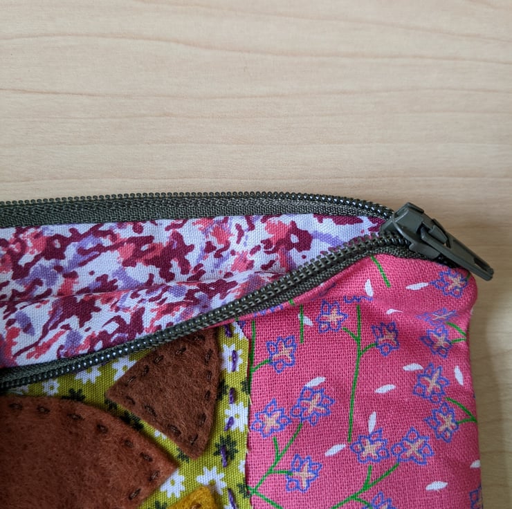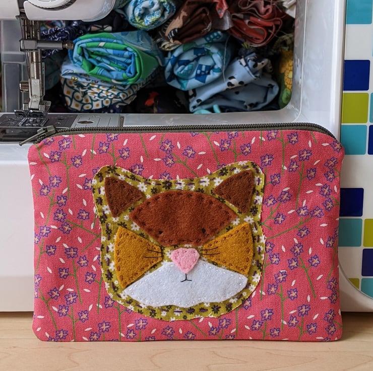Fully-lined, handmade and hand-appliquéd cat coin purse with khaki green zip and abstract pink, purple and white lining.