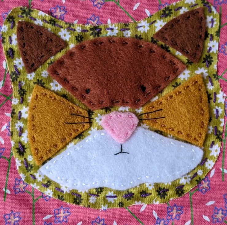 The main fabric is a dark pink 100% cotton with purple and white flowers with green stems. The cute appliqué cat is backed with a green cotton with dark green and white flowers. Brown,white and light pink felt overlays have been hand stitched in place using an appliqué technique to form the cat.