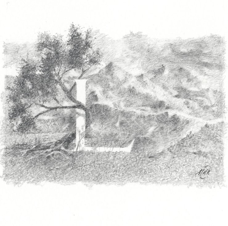 Beautifully drawn illustration of the letter 'L', image area, 115 mm w x 85 mm h, incorporating the image of a landscape, executed using a 2B graphite pencil on Bockingford hot pressed watercolour paper. This image is one of many that I will produce using calligraphic and constructed letters with images incorporating various subjects and media. I prefer to keep the images as spontaneous as possible, simply enjoying colours, shapes and texture rather than producing photo realist images. Watching the birds in the garden in the Spring triggered the idea of starting with birds, particularly when they are caught in 'movement', dramatic and beautiful.