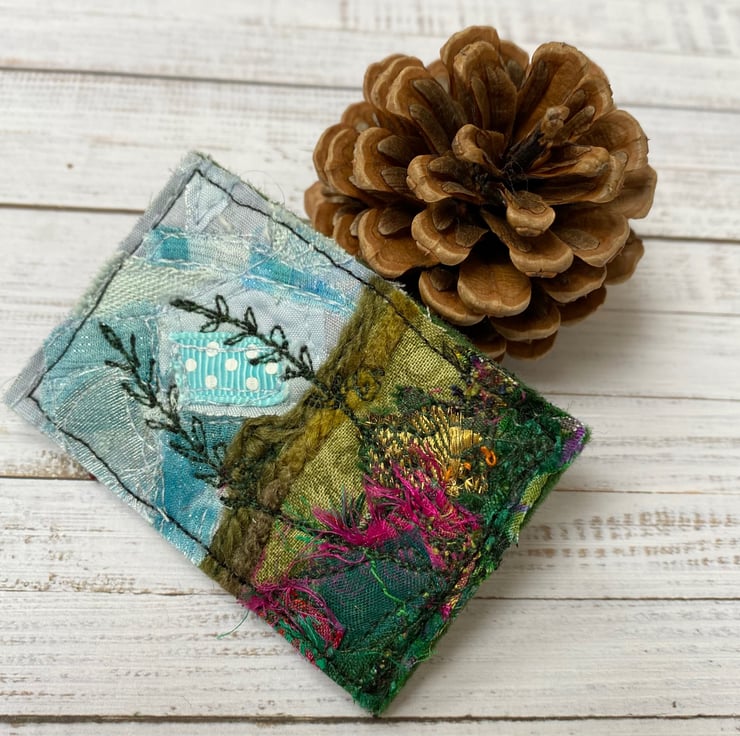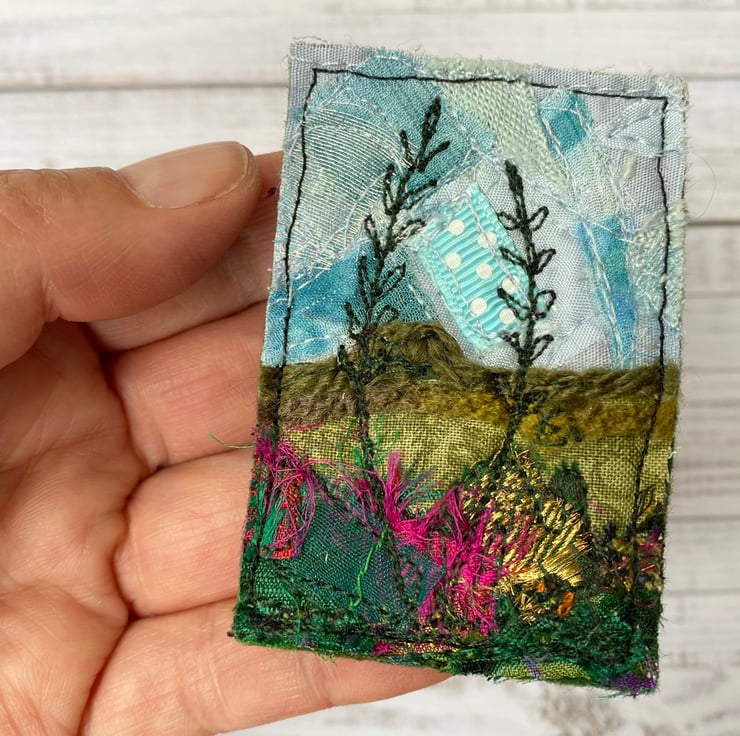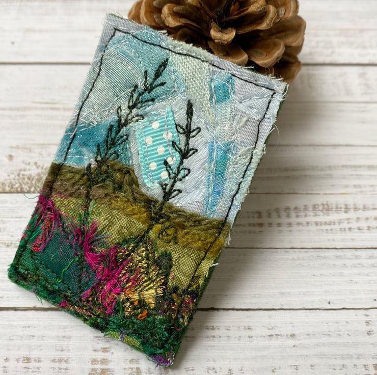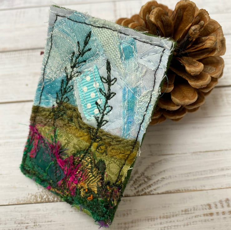 This beautiful handmade free motion embroidered hedgerow plants and grasses landscape brooch is made from up-cycled fabrics. It is felt backed, and has a brooch pin with a safety catch on the reverse to keep it nice and secure. It measures 5 x 7cm approx.