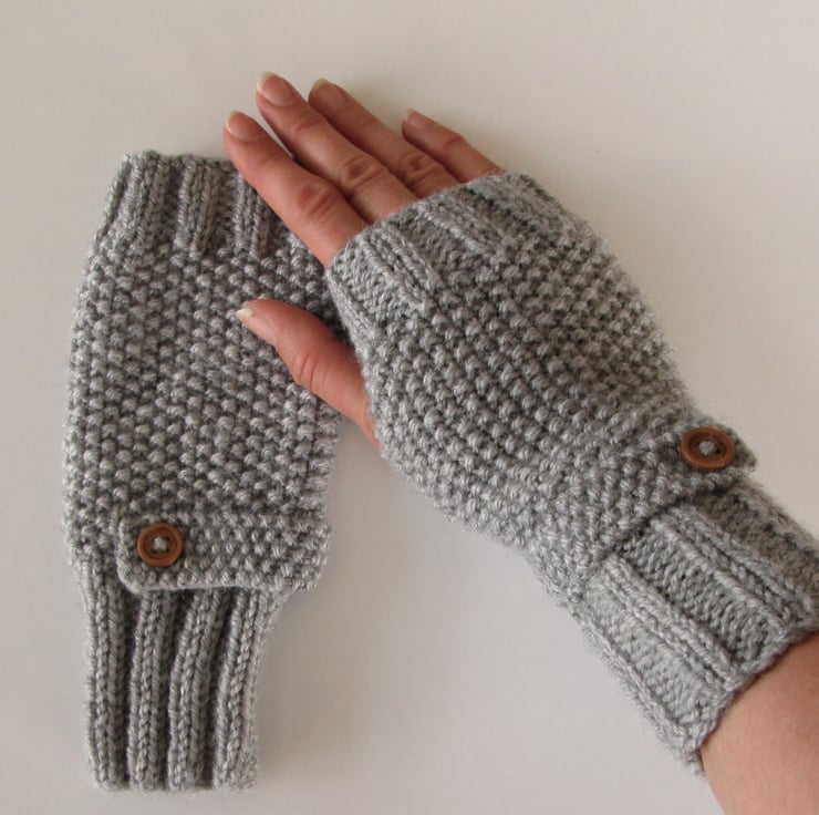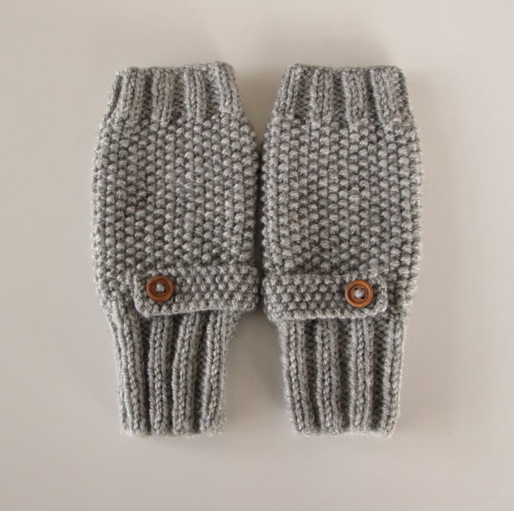 These grey fingerless mittens / wrist warmers / gloves are knitted in a rib and moss stitch pattern and are hand knitted in a lovely and warm Aran wool, which comprises of 25% pure wool and 75% acrylic wool.