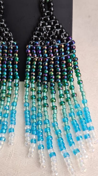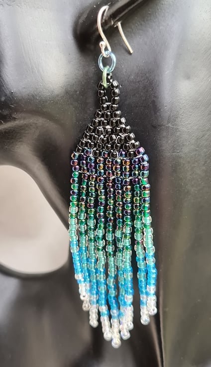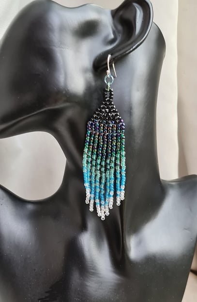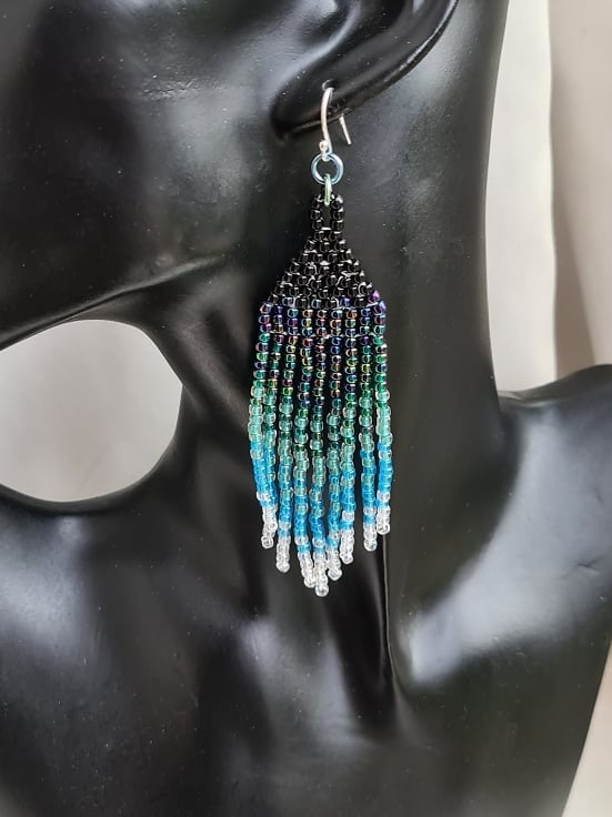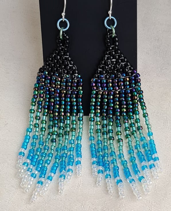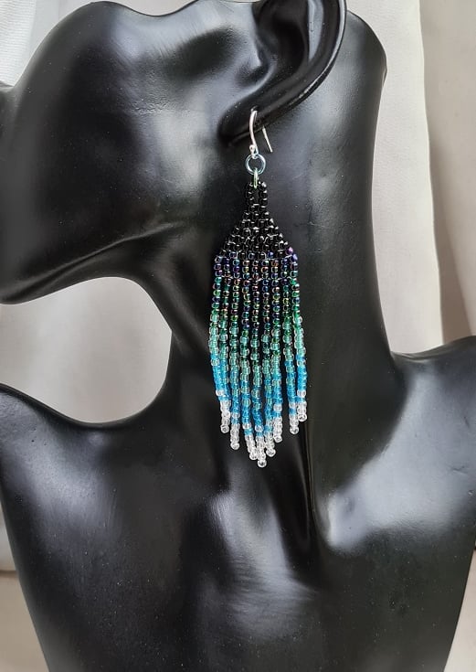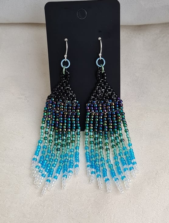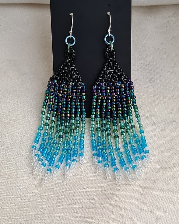 A gorgeous cascade of tiny seed beads in an ombre-like design. Starting off with Jet Black beads at the top and moving through Rainbow-Iris colours to gorgeous Green, beautiful Blue then an AB Clear/White. Gorgeous dangly seed bead earrings, great as an unusual handmade gift.