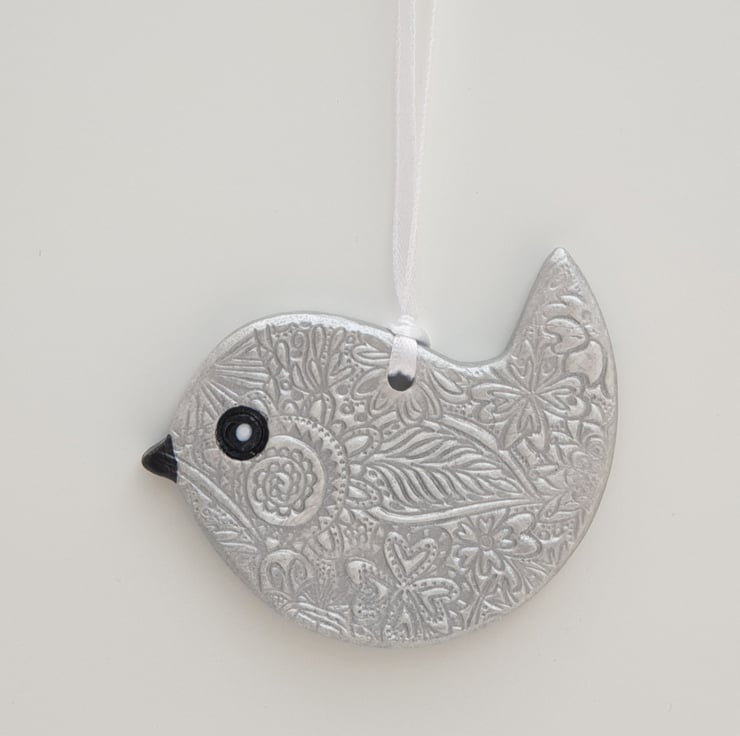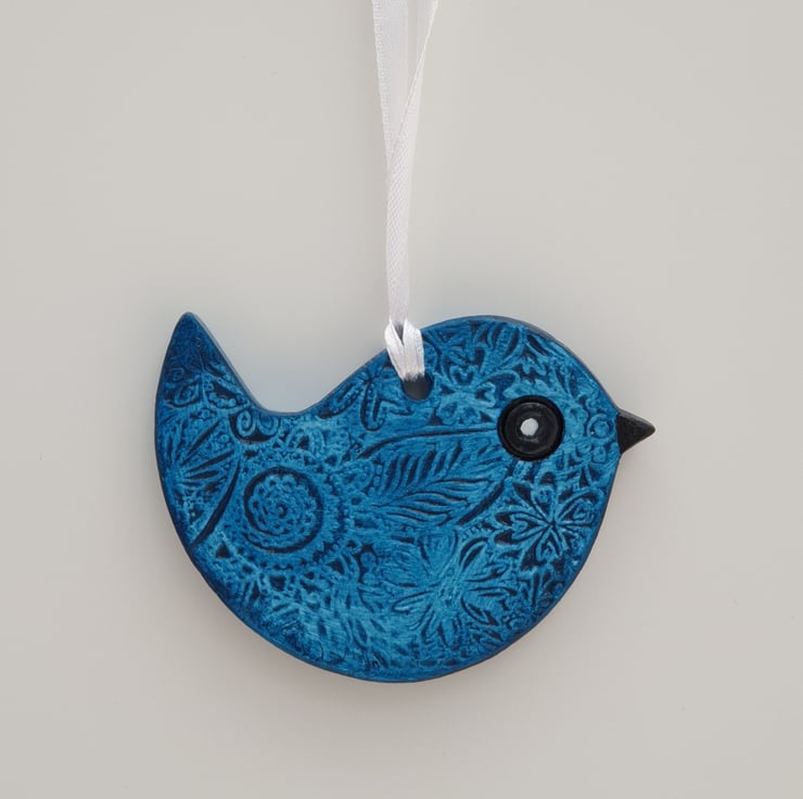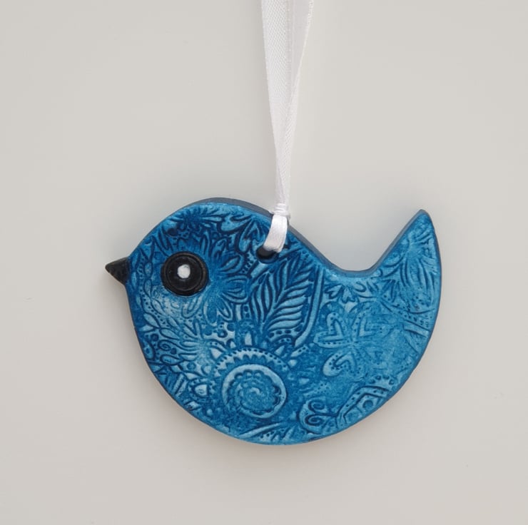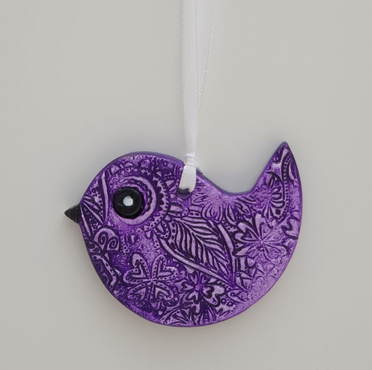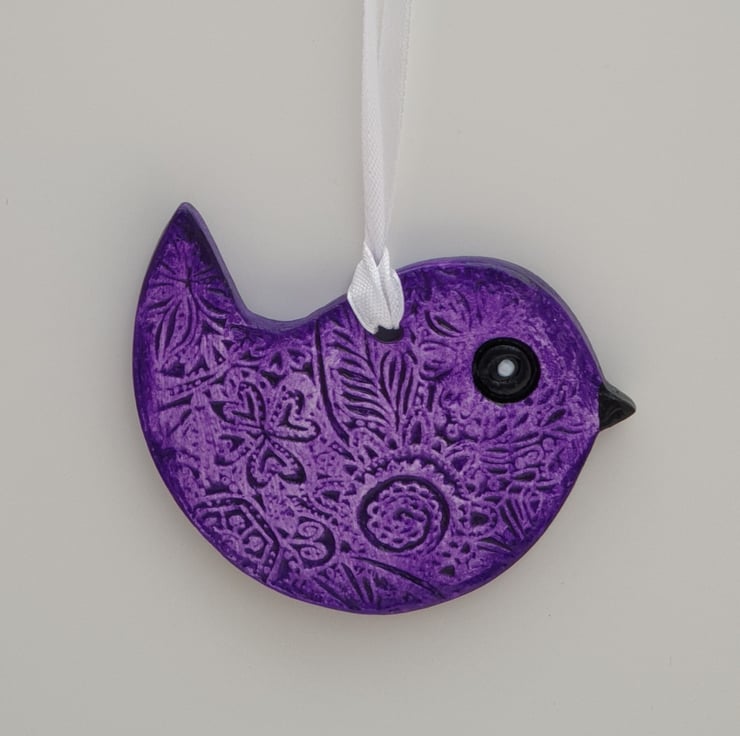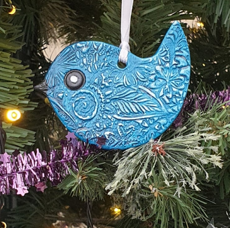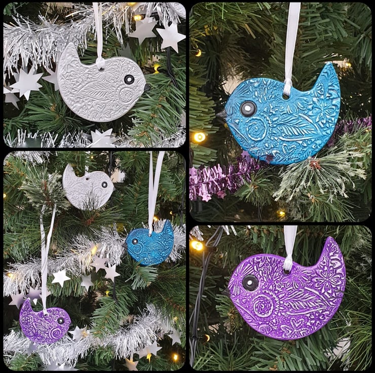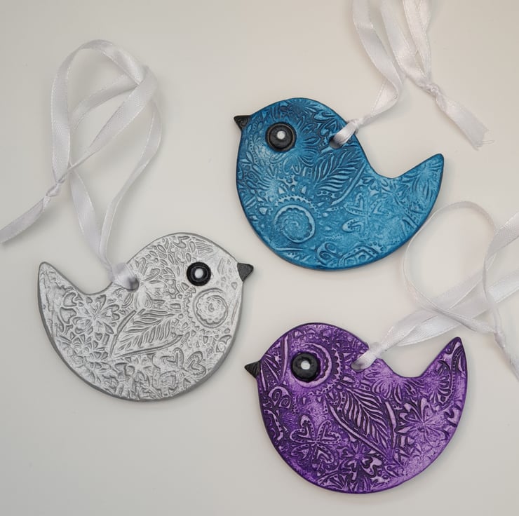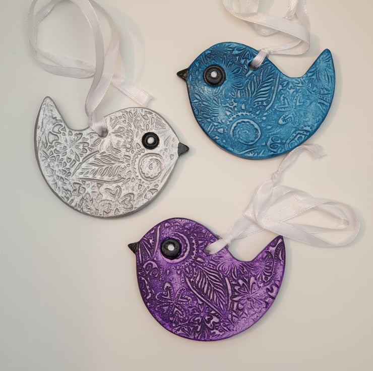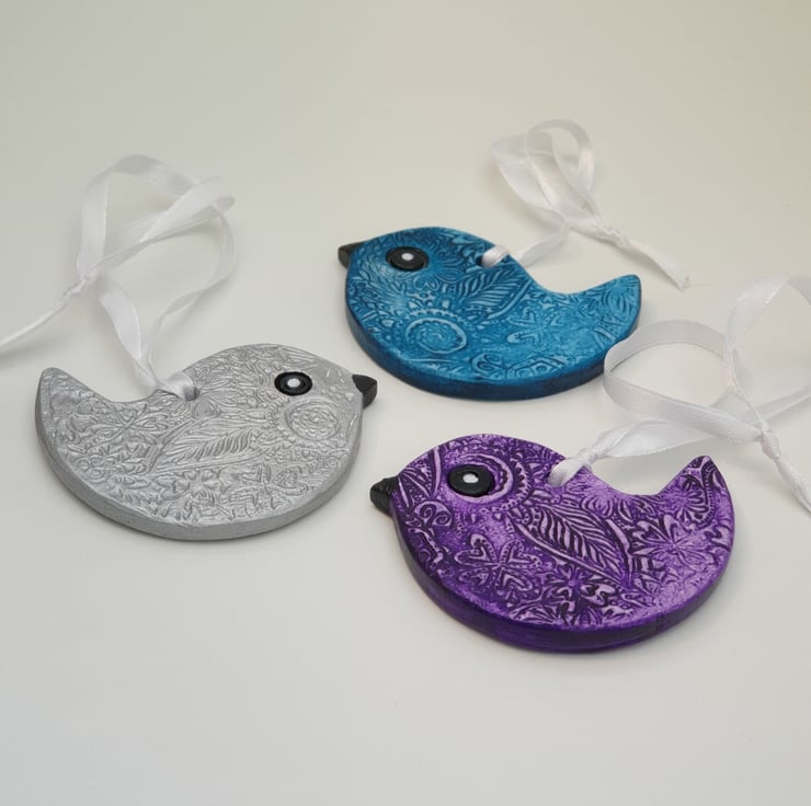 Set of 3 pretty clay bird hanging Christmas decorations one of each in teal blue, purple and silver. Each bird has been lovingly created from air dry clay and embossed with a decorative pattern on both sides painted with acrylics and finally varnished. They come finished with white satin ribbon ready to hang.