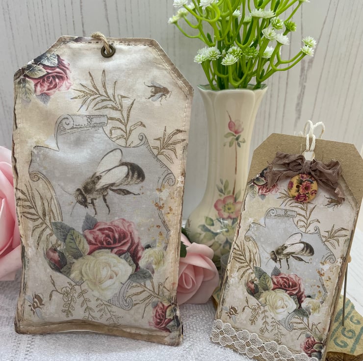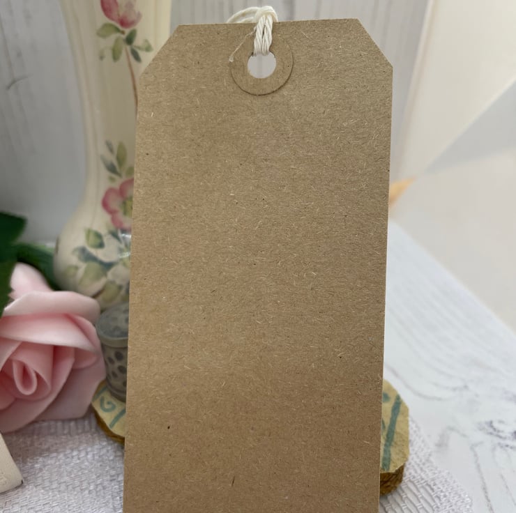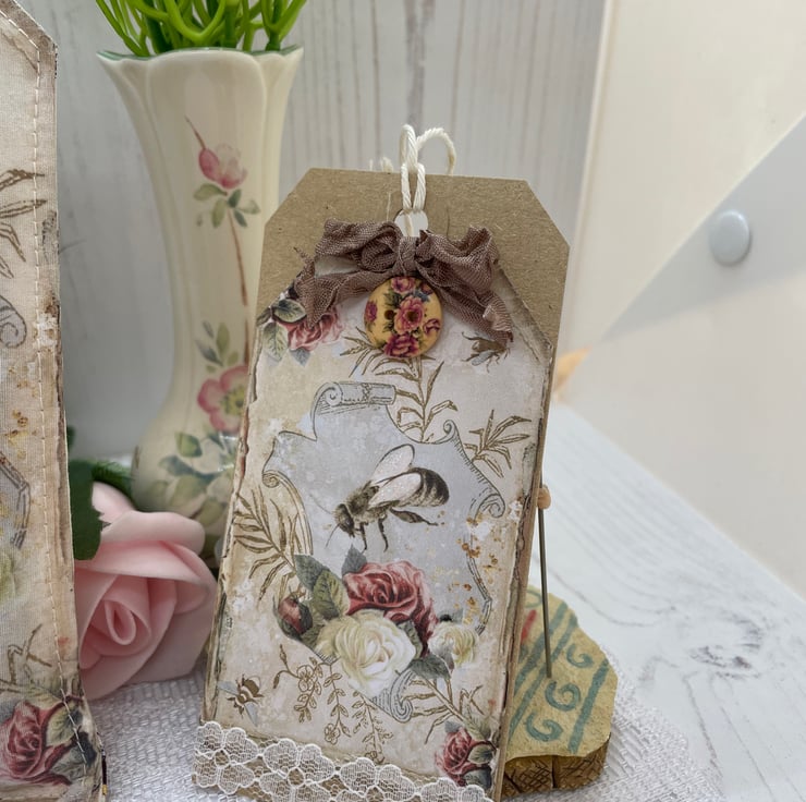 Tag of the same design with brown crinkle bow, wood button, lace and glitter.