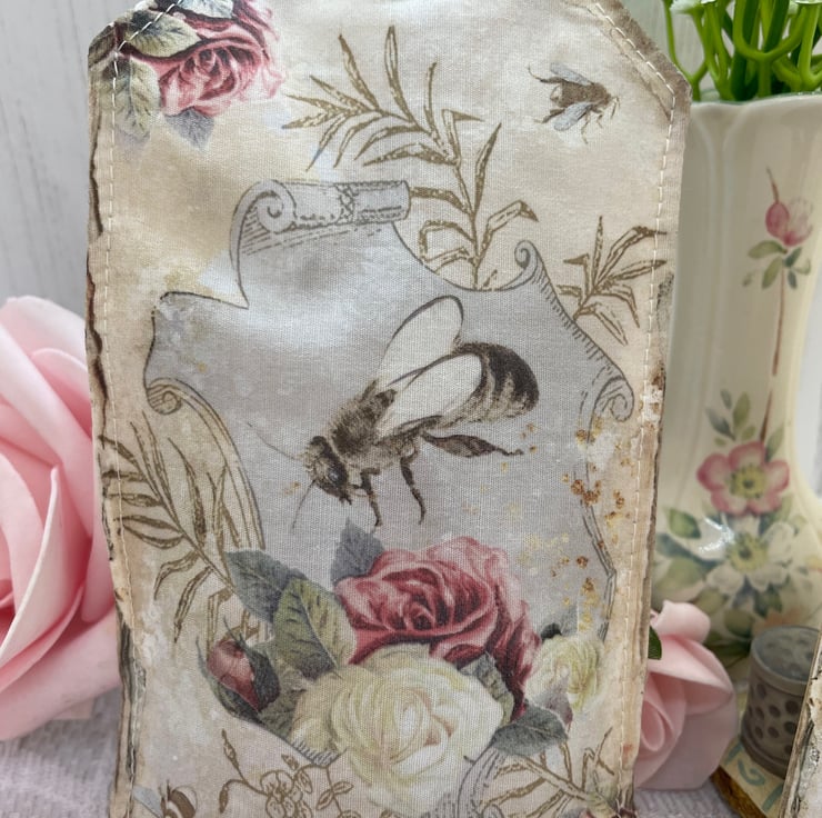 Pretty Queen bee design printed onto cotton, filled with lavender from Chateau de la Gabelle. Bronze eyelet and string for hanging.