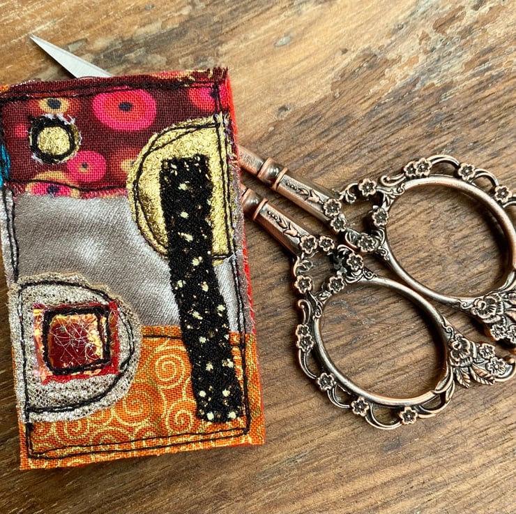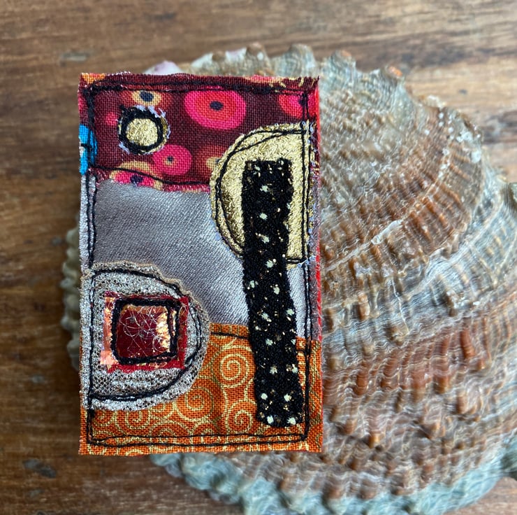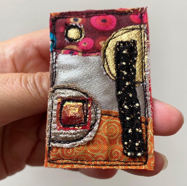 This stunning handmade free motion embroidered geometric abstract brooch with is made from up-cycled fabrics, and based on the work of Gustav Klimt. It is felt backed, and has a brooch pin with a safety catch on the reverse to keep it nice and secure. It measures 7 x 5cm approx.