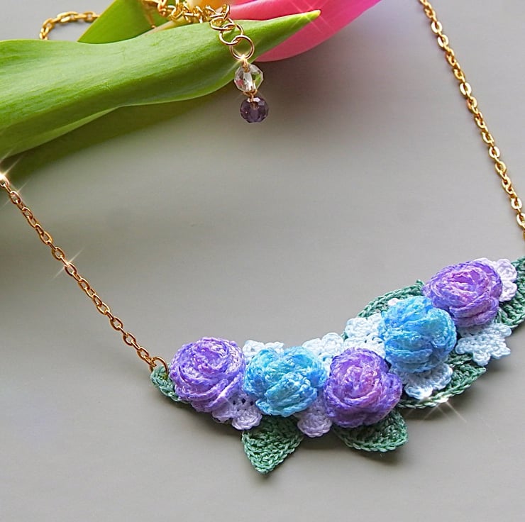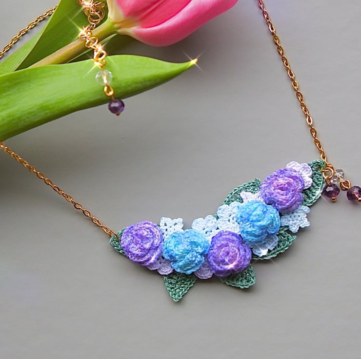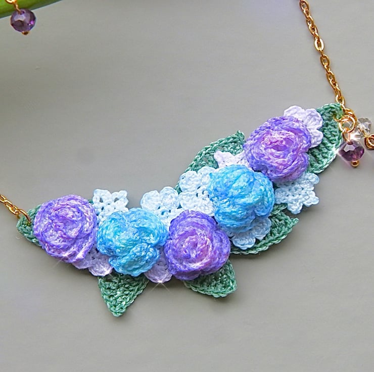 Necklace made with 6mm Purple and Clear Crystal glass beads and Embroidery Threads.