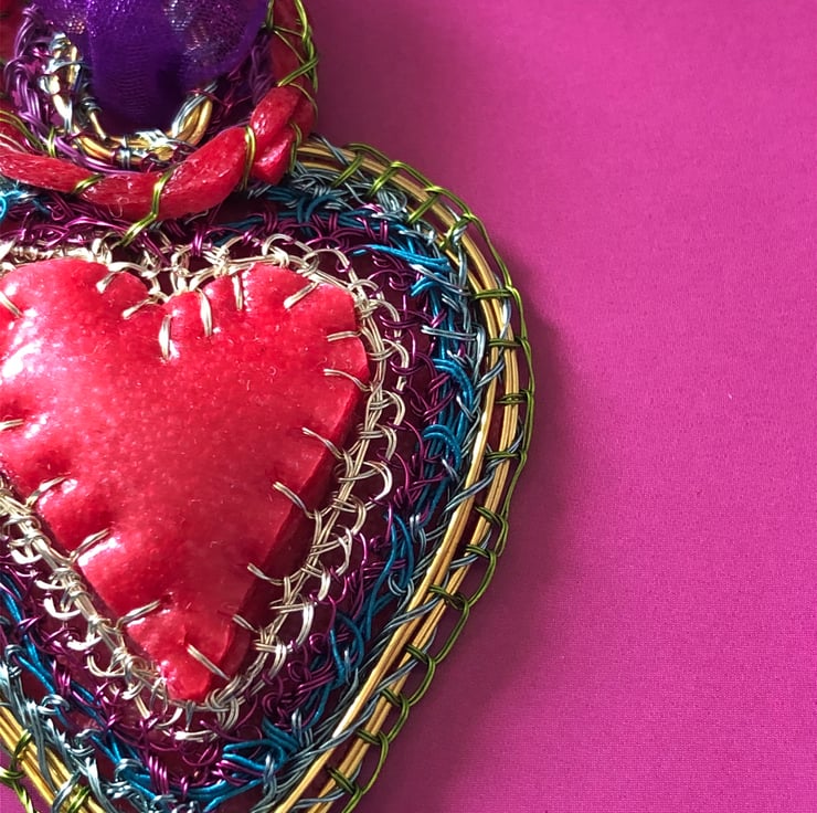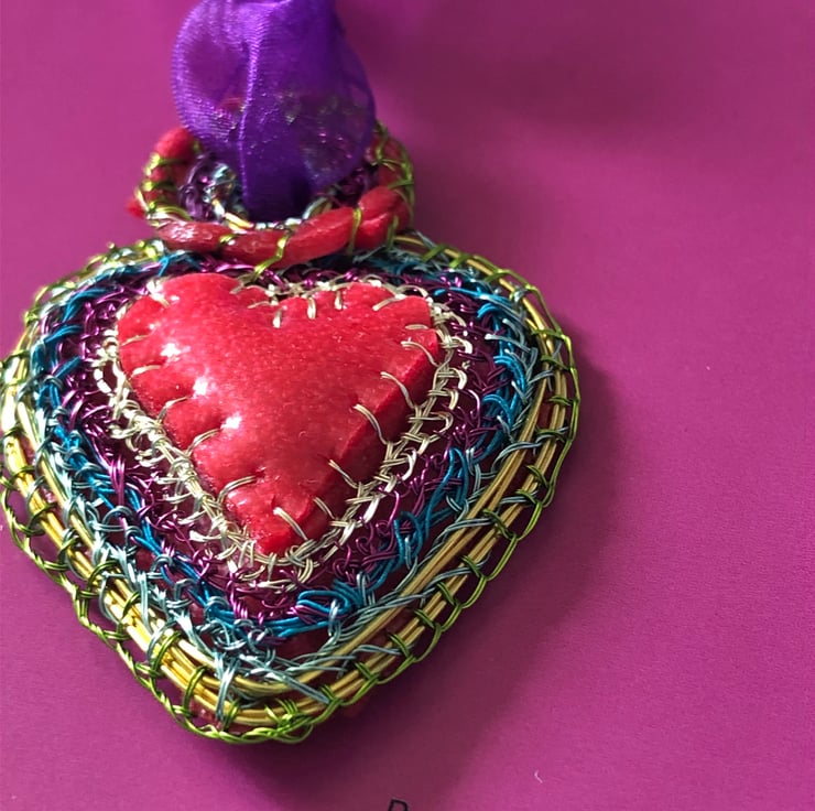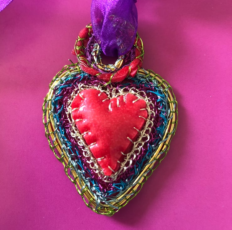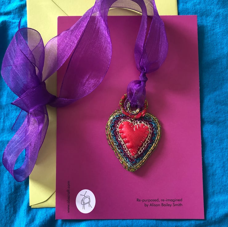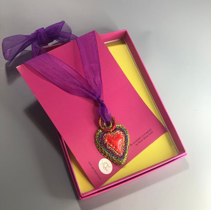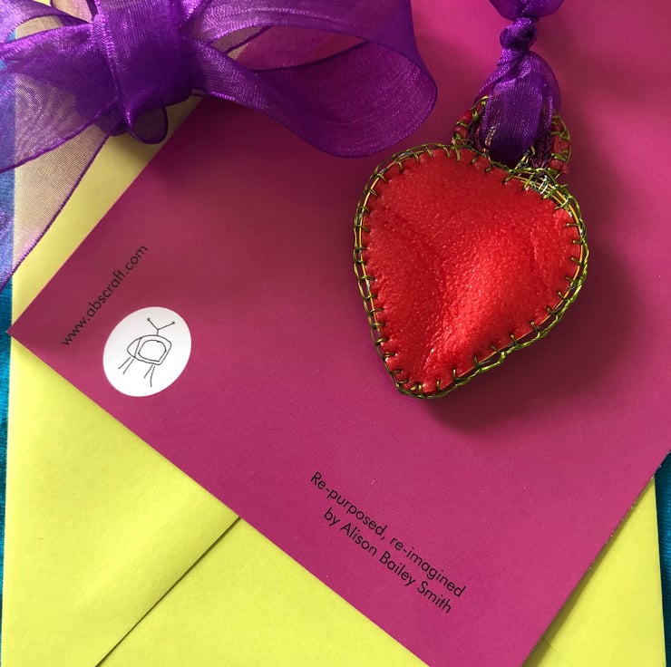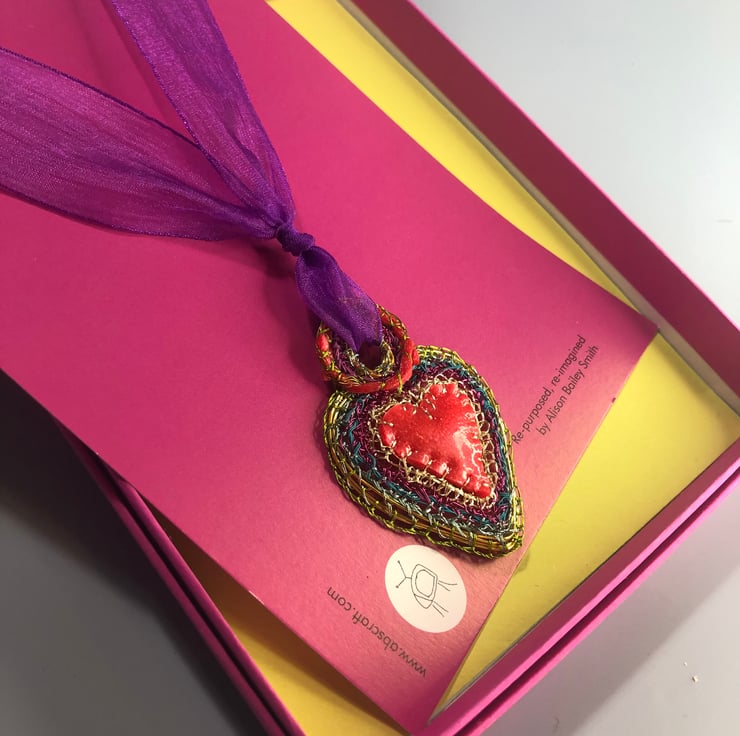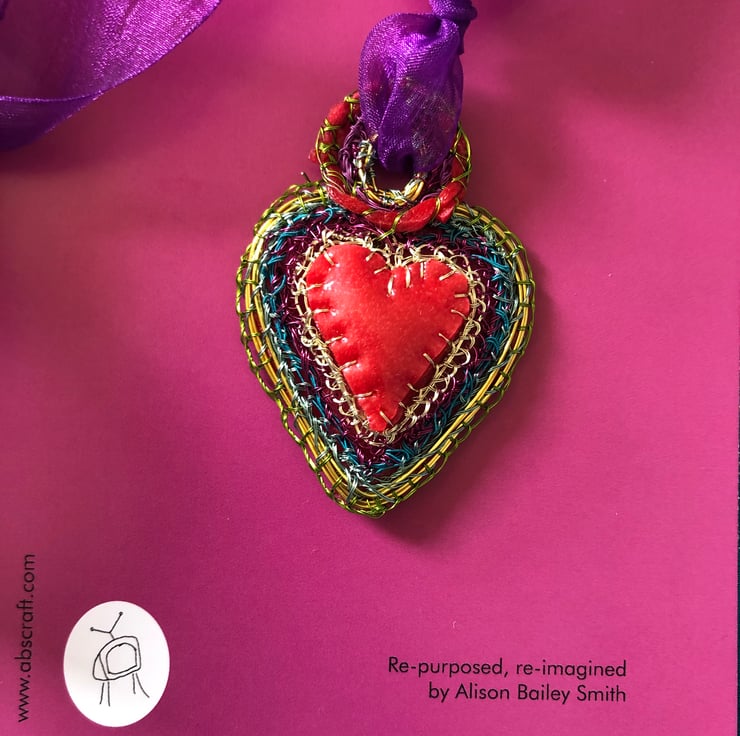 SOLD: Heart pendant with red rubber made with recycled and bought materials by me, Alison Bailey Smith in August 2022. The pendant is light and colourful, with bright joyful rainbow colours. Created by hand using gathered and hoarded materials, using stitching and wrapping techniques.