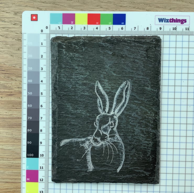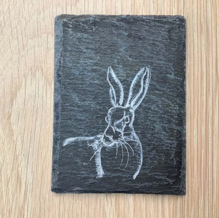 A lovely hare - on the lookout. This picture is carved onto a piece of slate. It is provided with the display easel which is included in the price.