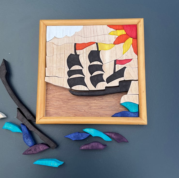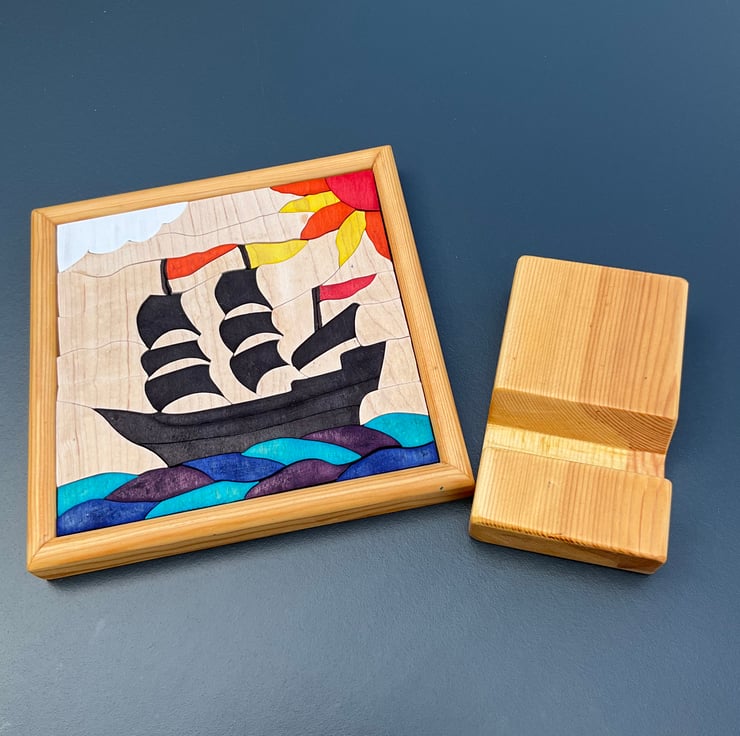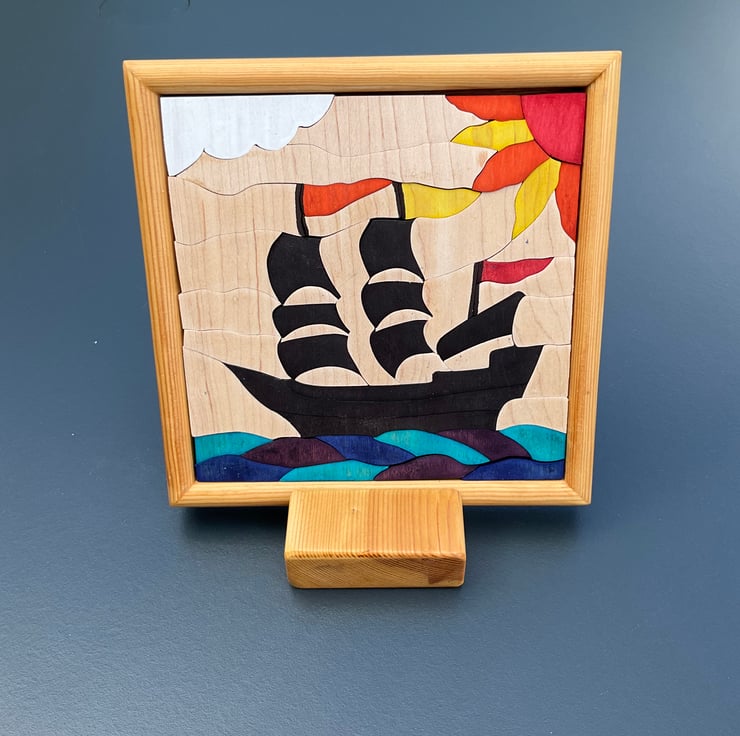Colourful wood puzzle designed in sailing ship pattern, an ideal gift. The puzzle can either be laid flat or mounted vertically in the supplied holder as an ornament. The frame edging is made from pine with plywood backing.The puzzle itself is made from 10mm thick maple, stained in bright colours, and coated in a hardwearing lacquer providing a satin finish.