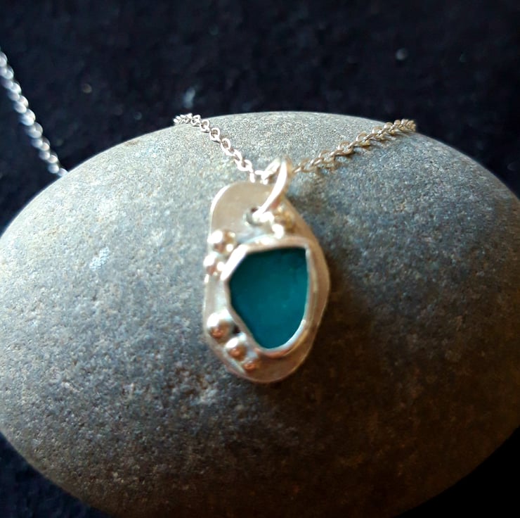 Gorgeous and striking piece of seaglass set in antique silver and strung on a silver chain - the setting features a few silver grains of sand. The pendant itself is just under 2cm long but because of its unusual clear colour it is very striking.