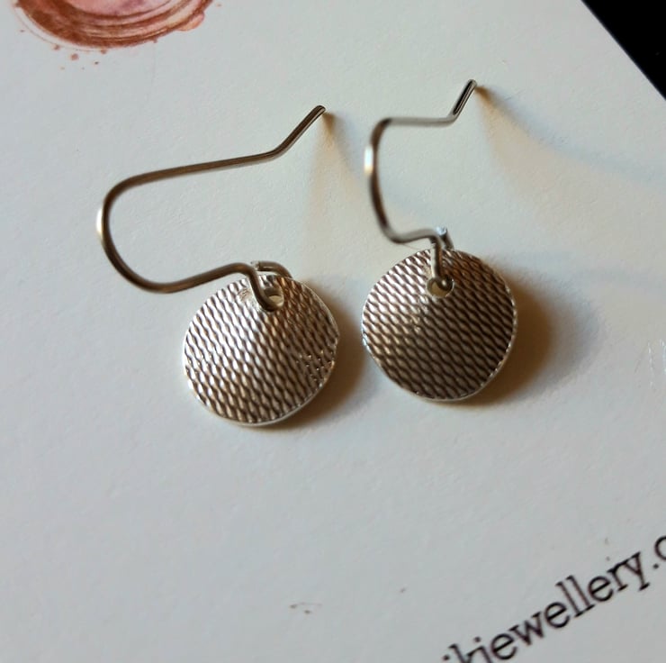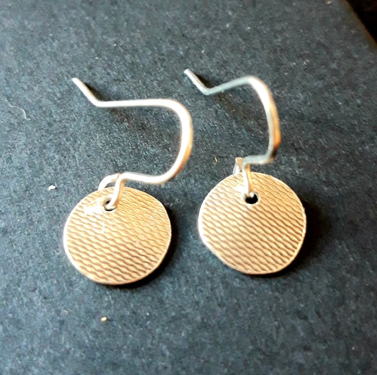 These earrings have been handcut from an antique silver cigarette case. They are approx 1cm in diameter and are a simple but classic pair of drop earrings. Strung on silver loops.