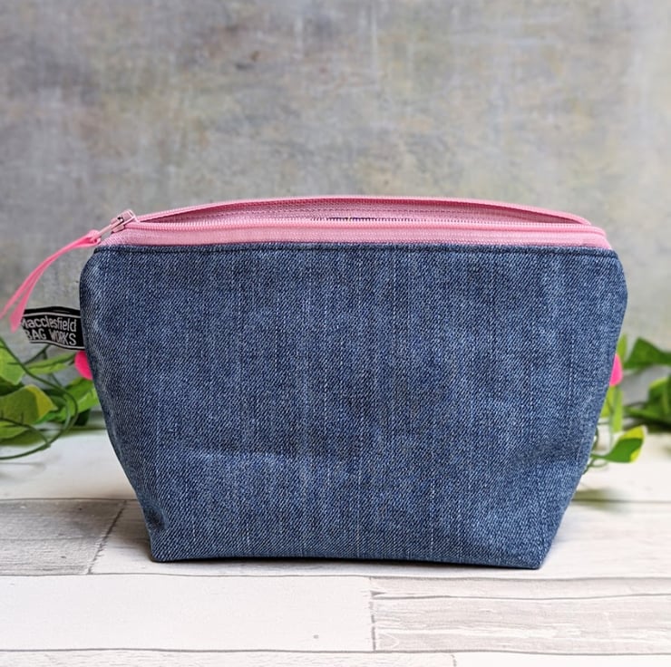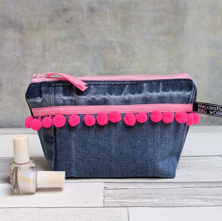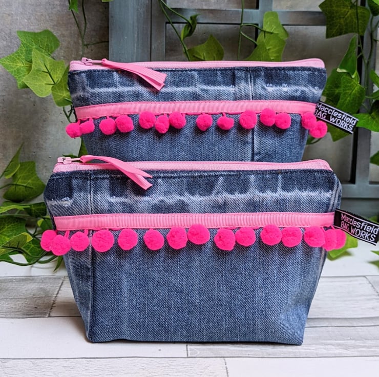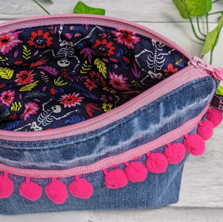 Sections of recycled, pre-loved denim have been carefully chosen and cut used to create these handmade, boho style pouch bags. Use as a make-up bag or pencil case, the front has been decorated with vibrant pink pom-pom trim with a pale pink grosgrain ribbon. A pale pink zip and zip pull compliments the trim and inside is a quirky skeleton and flower print lining.