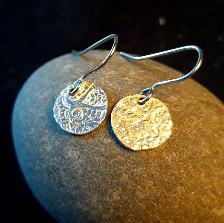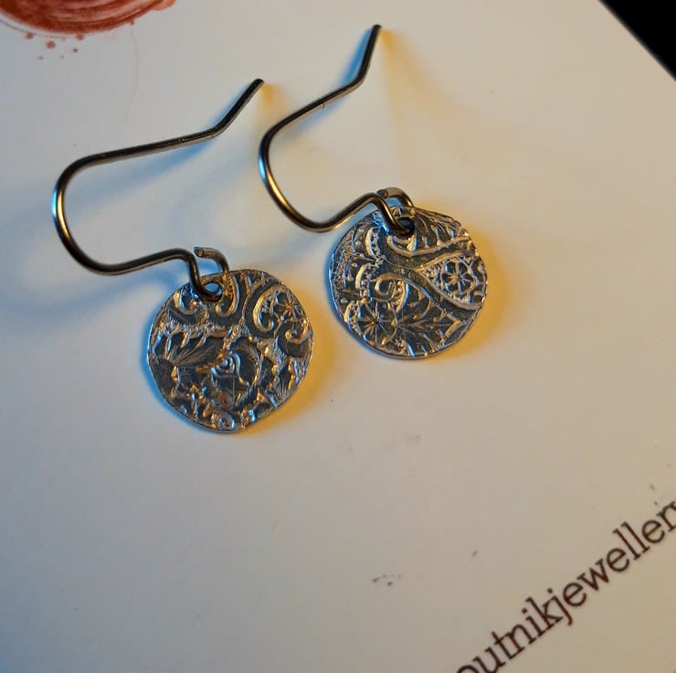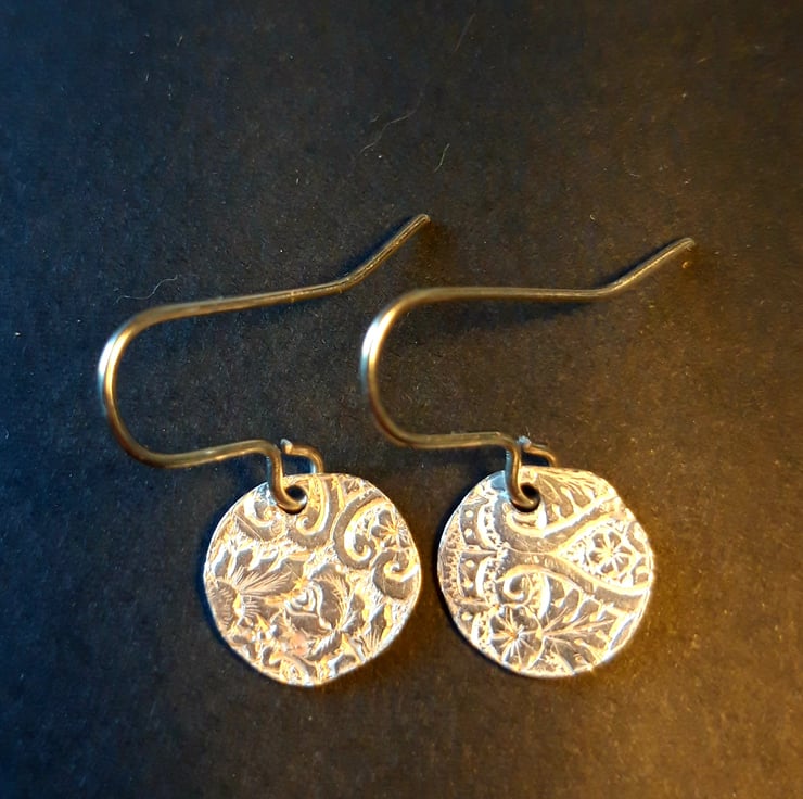 Gorgeous textured silver discs - approx 1.2cm across - hand cut from an upcycled cigarette case. Hung on silver loops.