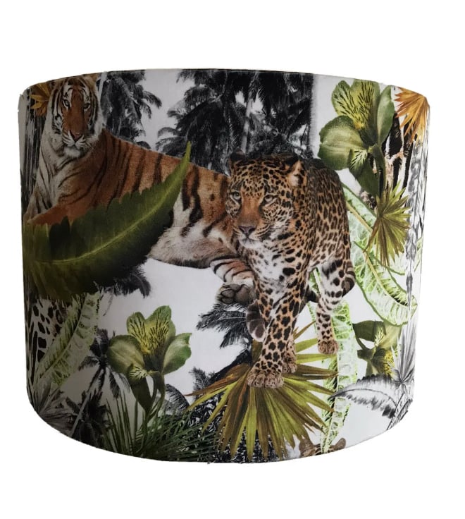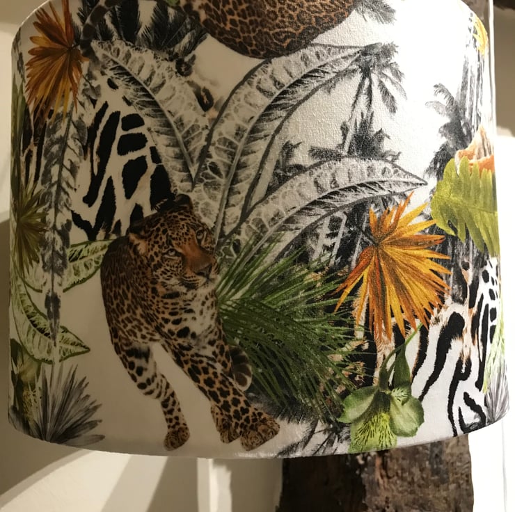 Gorgeous velvet lampshades in a vibrant safari print, available in various sizes and heights.