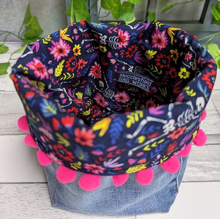 Funky and fun, these stylish storage baskets have been carefully hand-made using recycled denim and lined with a quirky flower and skeleton print cotton lining. They have been interfaced to give them a soft structured feel whilst still making them fold-able for posting.