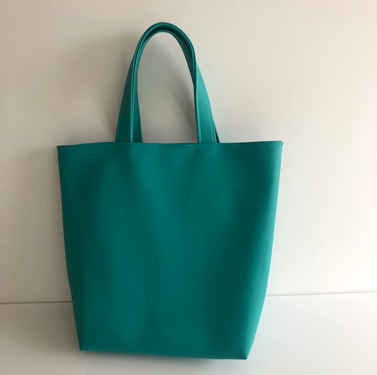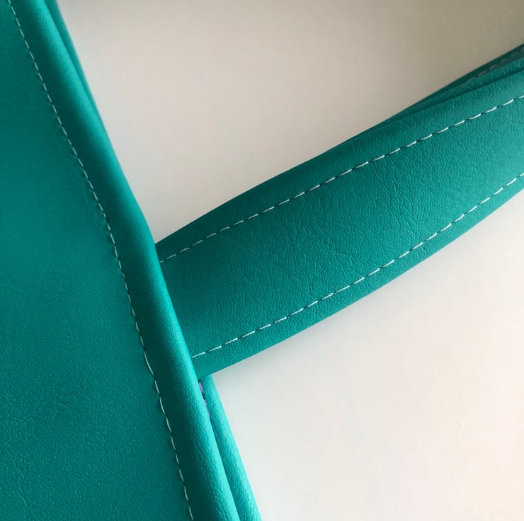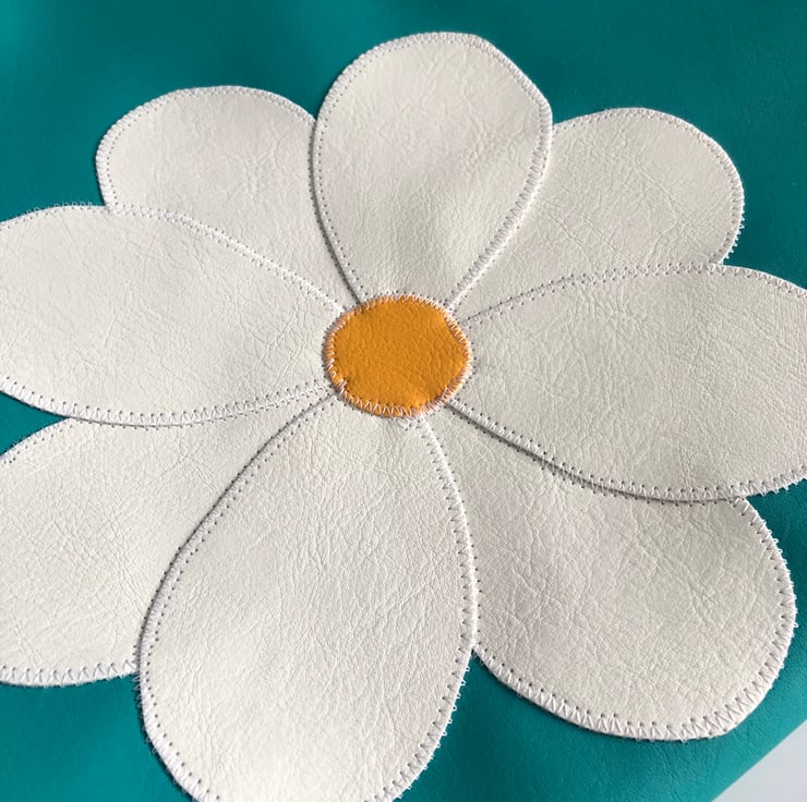 This butter soft turquoise faux leather has a white daisy with a yellow centre both in faux leather machine stitched to the front of this roomy tote bag.
