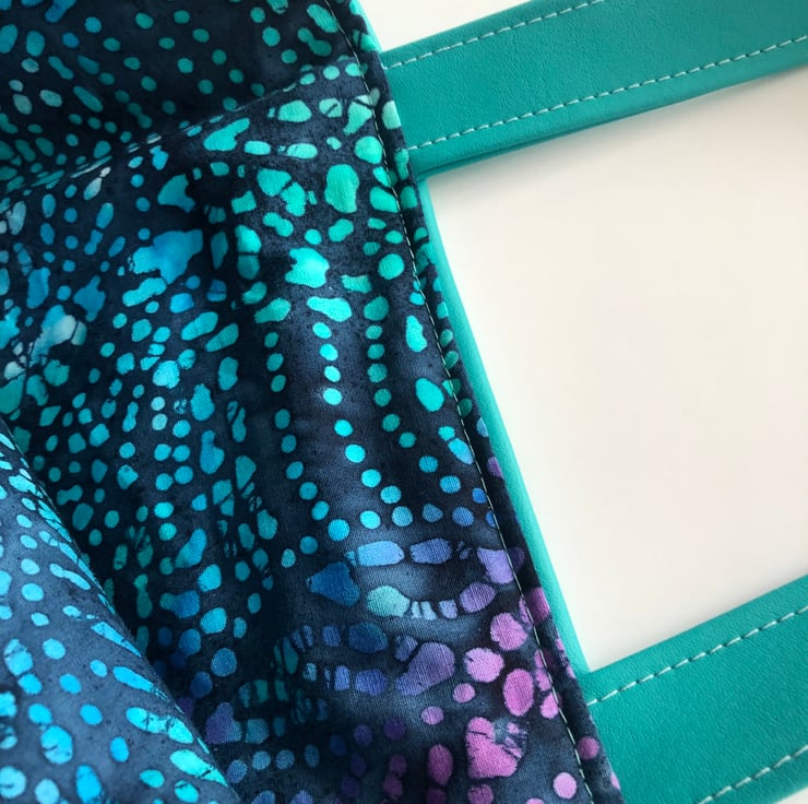 With matching handles with white top stitching and a blue and mauve batik cotton lining and a boxy bottom this smart bag could take you anywhere and is a lasting reminder of summer days.