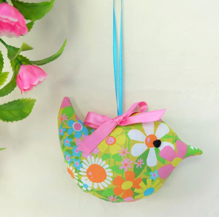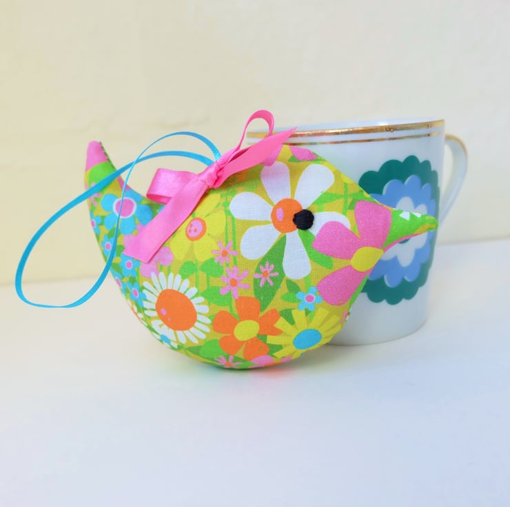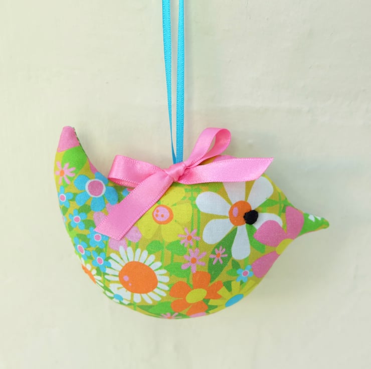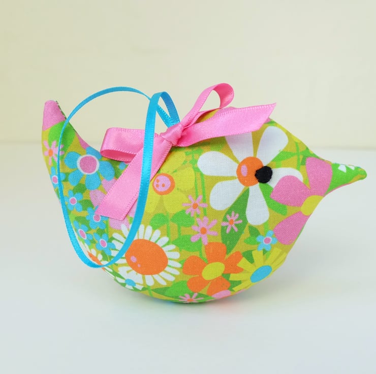 60's style lime green cotton fabric, with flowers in pink, orange, yellow, turquoise, pink and white and green leaves.The bird is filled with scoops of fresh, strongly scented organic lavender and toy stuffing for a good shape. I have hand sewn black embroidery cotton eyes on each side of the head and finished it with a pink satin ribbon bow.