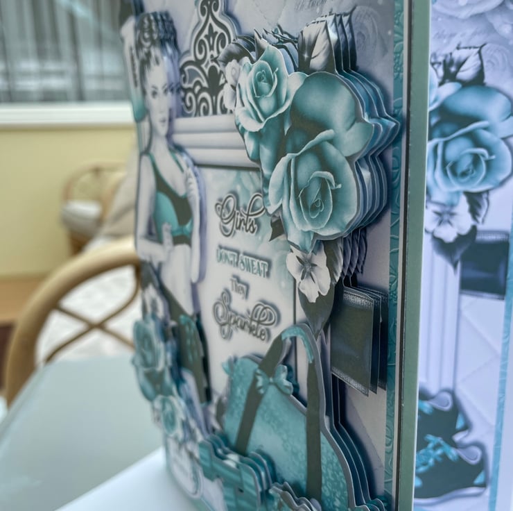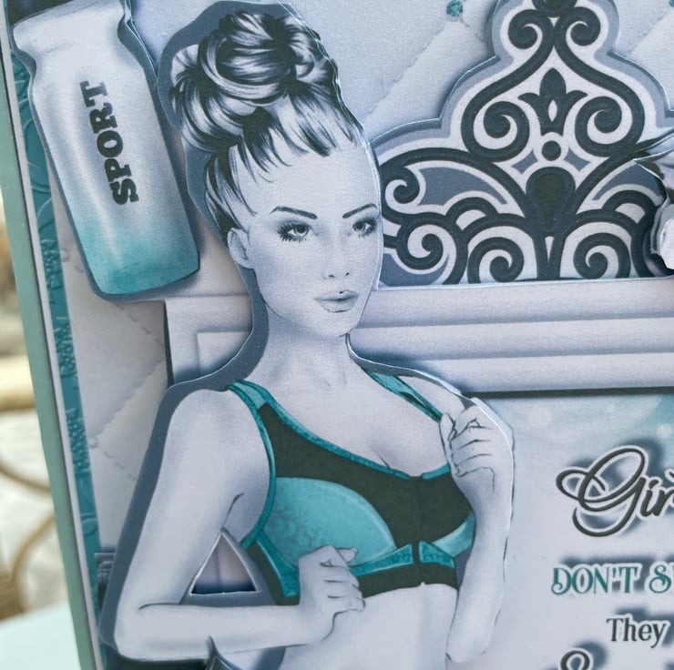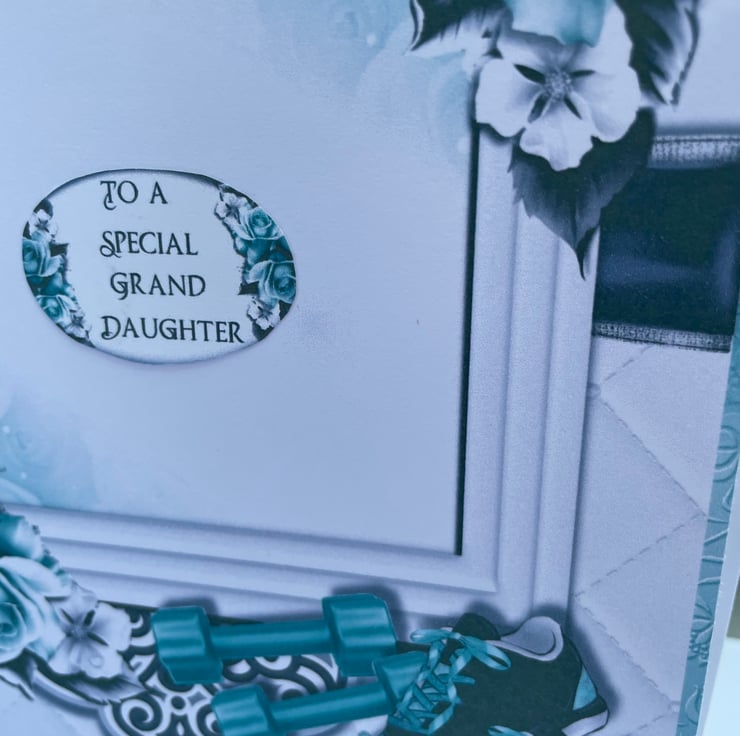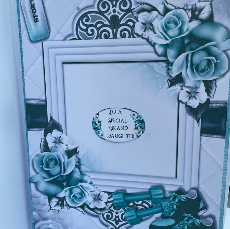 A truly unusual and beautiful card to celebrate a birthday. This A5 size card features a woman running. The card is embellished with exercise equipment and beautiful roses. The centre of the card has the greeting Girls don't sweat they sparkle and has happy birthday at the bottom. The card is heavily decoupaged to a deep level. Inside the card has a matching insert and currently has the greeting To a special granddaughter, this however can be changed another greeting such as With love, to a special daughter, to someone special, to fit to quit plus more. It is possible to change it to whatever you want. The birthday greeting on the front could aldo be changed to something else. A luxury card to send to someone special.