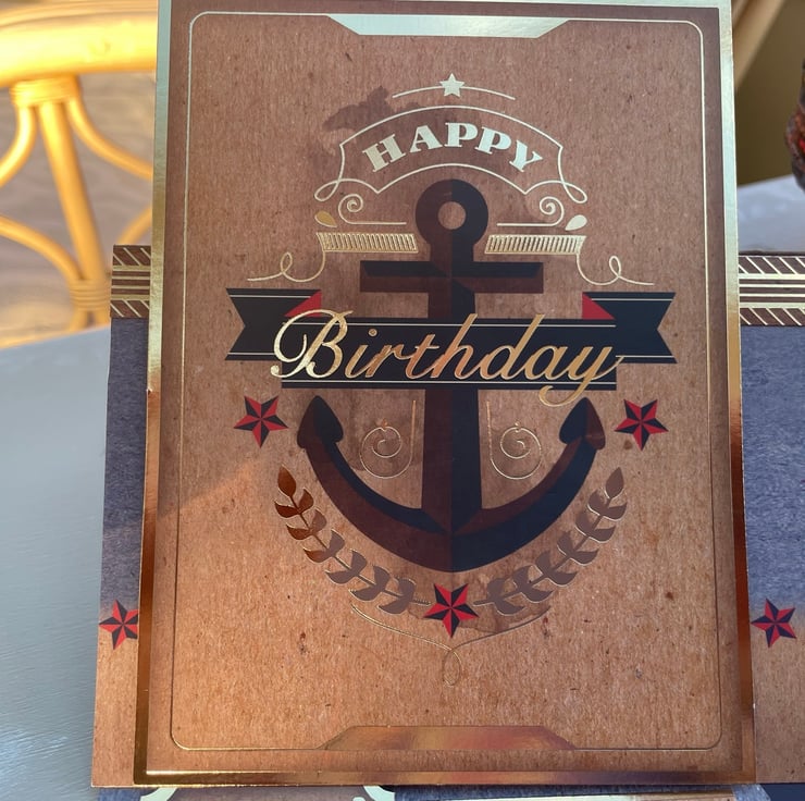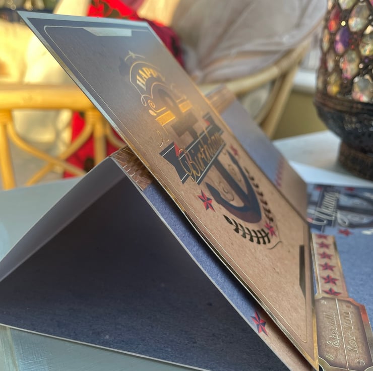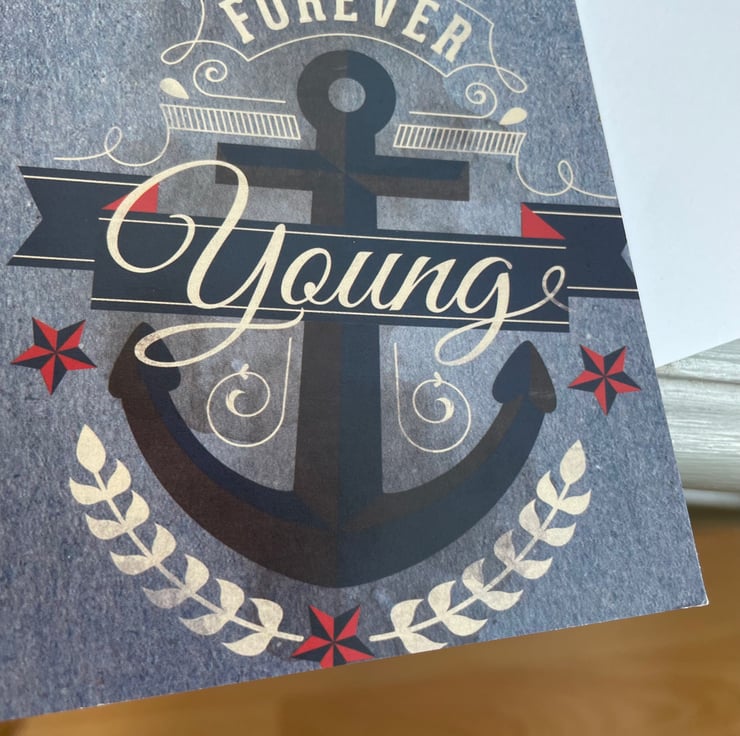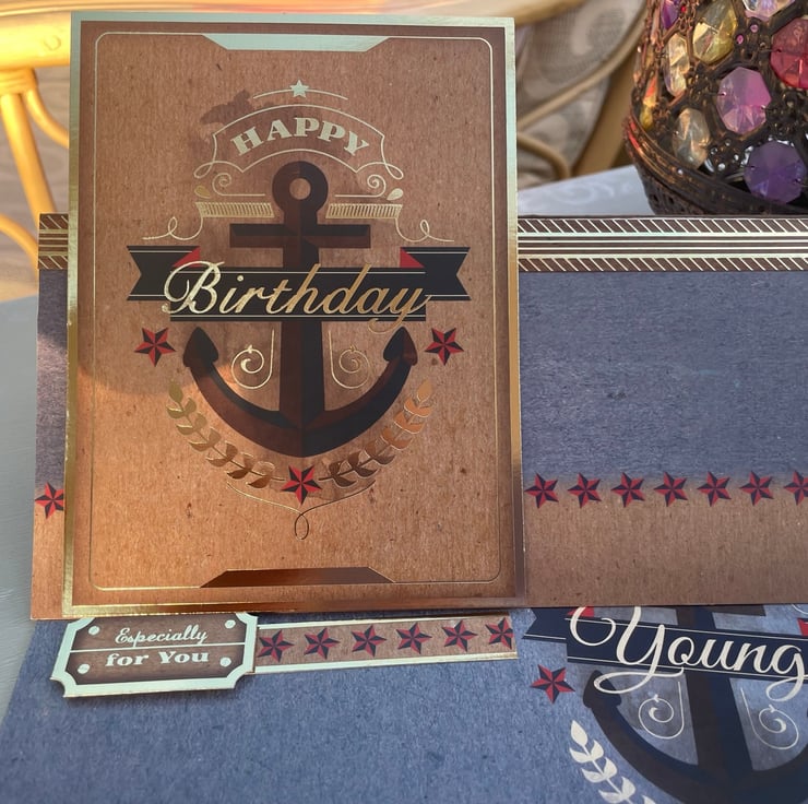 A little something for the golden oldies. This 20x20cm easel card features a main design with an anchor and says happy birthday, it is decorated with stars and leaf sprigs. The base of the card has a grey background and has a matching anchor design that says Forever oung. More stars decorate the base with a greeting that says Especially for you.