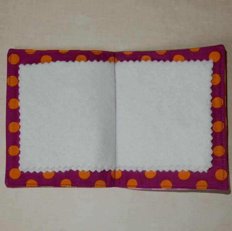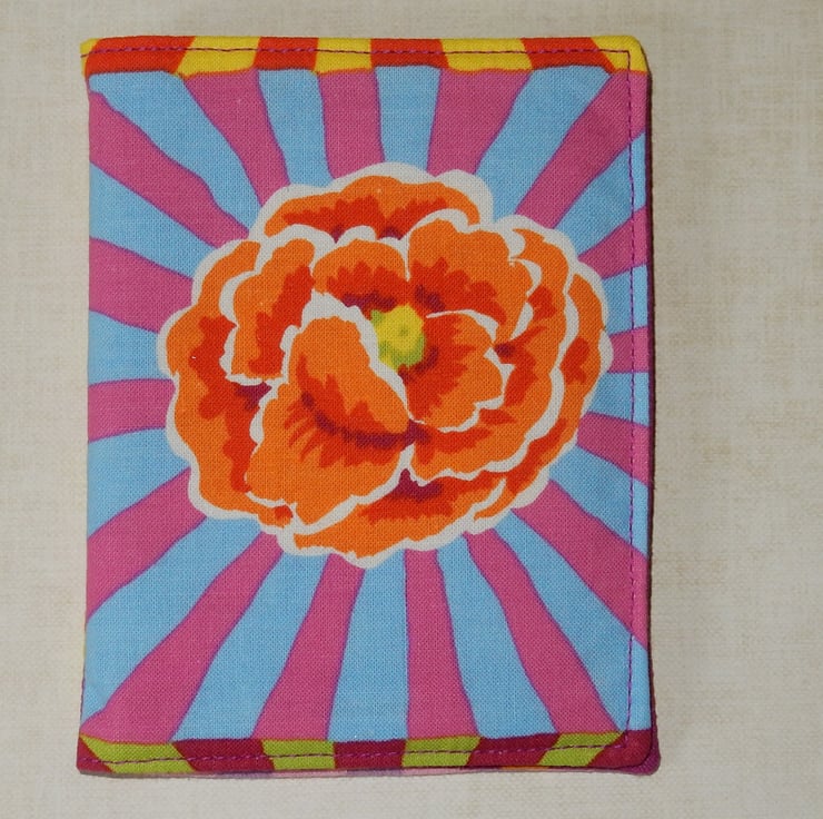 This bright floral needle case makes me think of summer and would be a cheerful accessory all year round. The needle case measures approx. 4.5 x 3.25 inches , and it is lined in a bright spot fabric and has four felt leaves for your pins and needles.