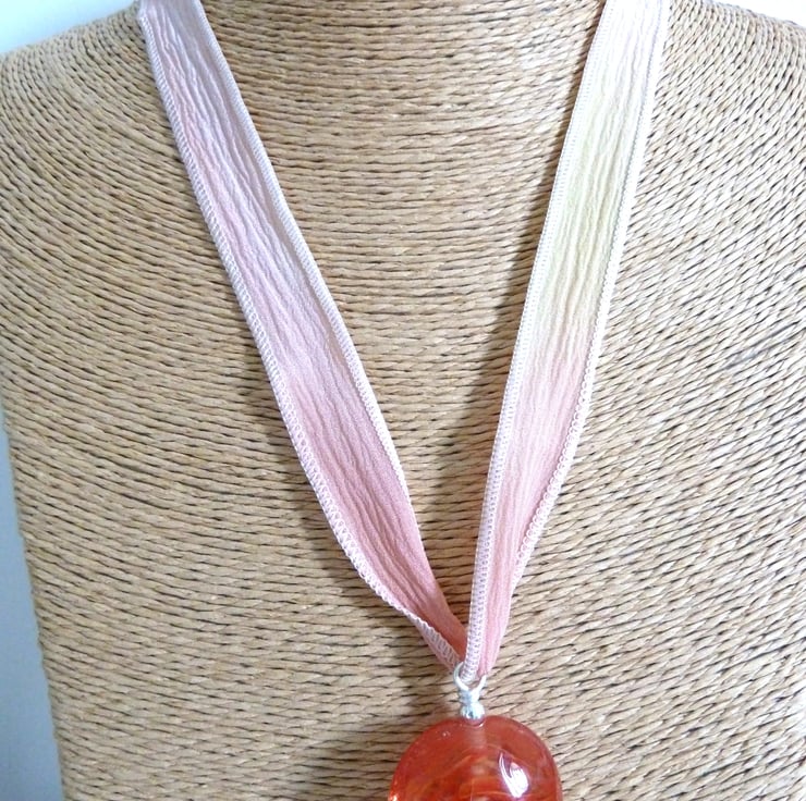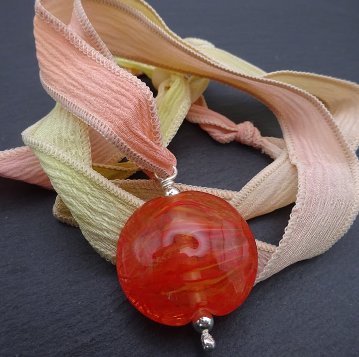A necklace made with hand dyed silk ribbon, it features a handmade lampwork glass pendant.
