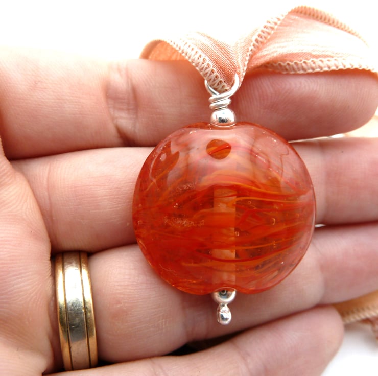 The pendant has been handmade by me using red glass and has been strung with sterling silver beads.