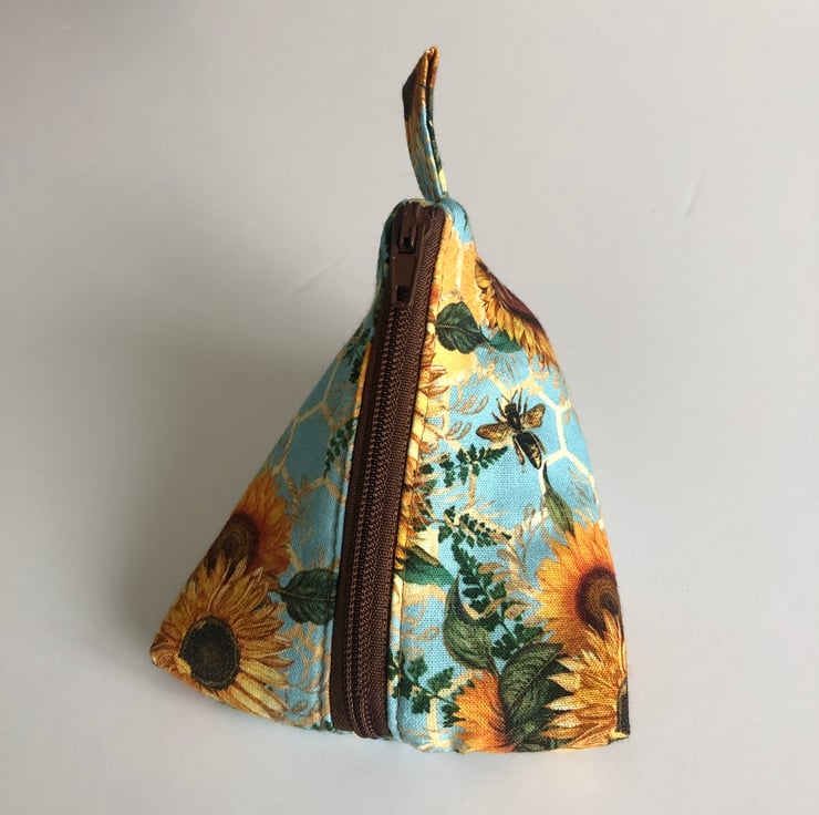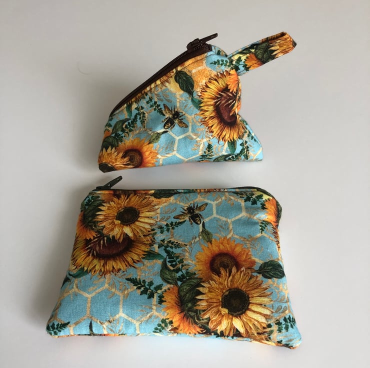 This fun set of a coin purse and pyramid purse are sewn from a cotton fabric with a blue honeycomb background and a design of bees and sunflowers in shades of golds, browns and greens.
