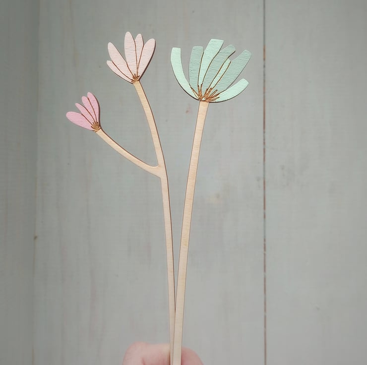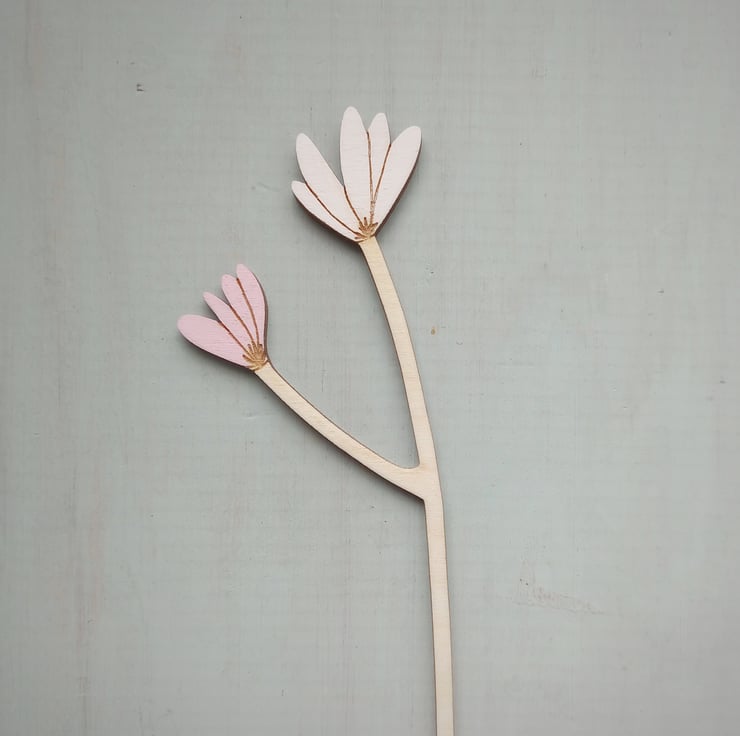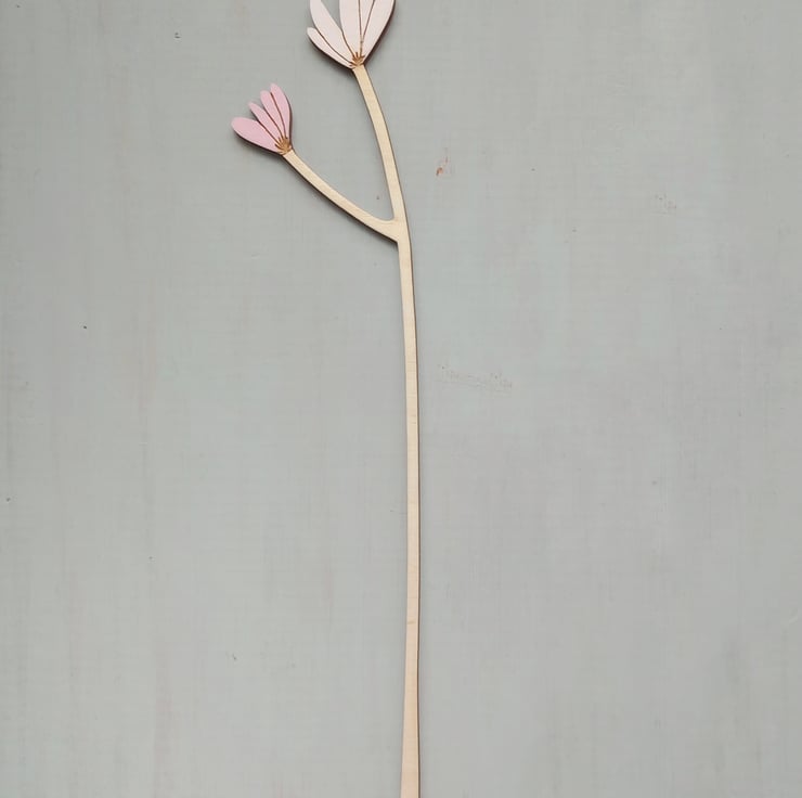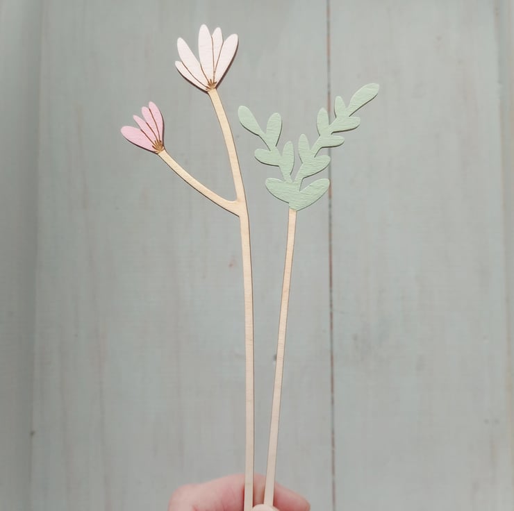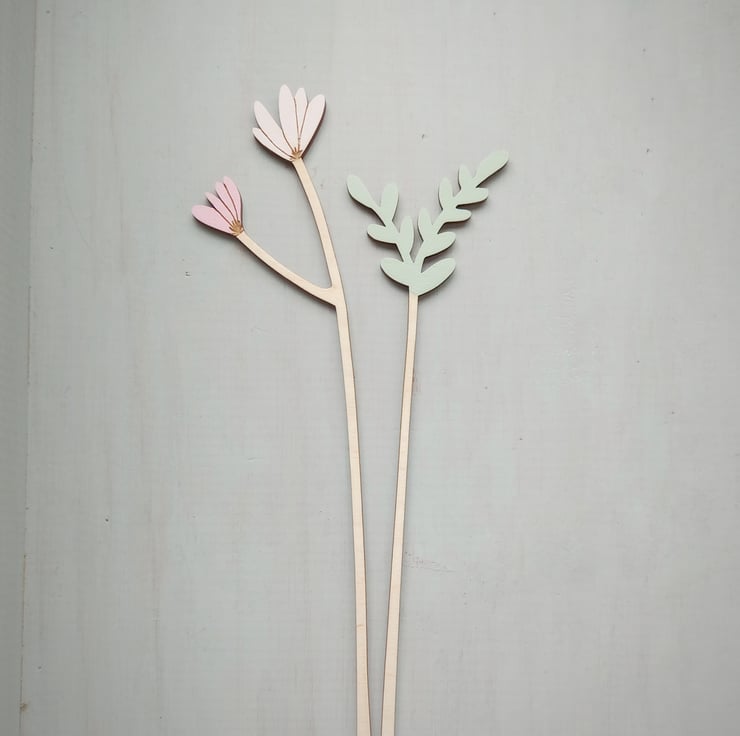Made from high quality 3mm laser cut birch plywood painted on one side with engraved details, the double flower stem measures approx 24.5cm, and the double sprig measures approx 22.5cm.