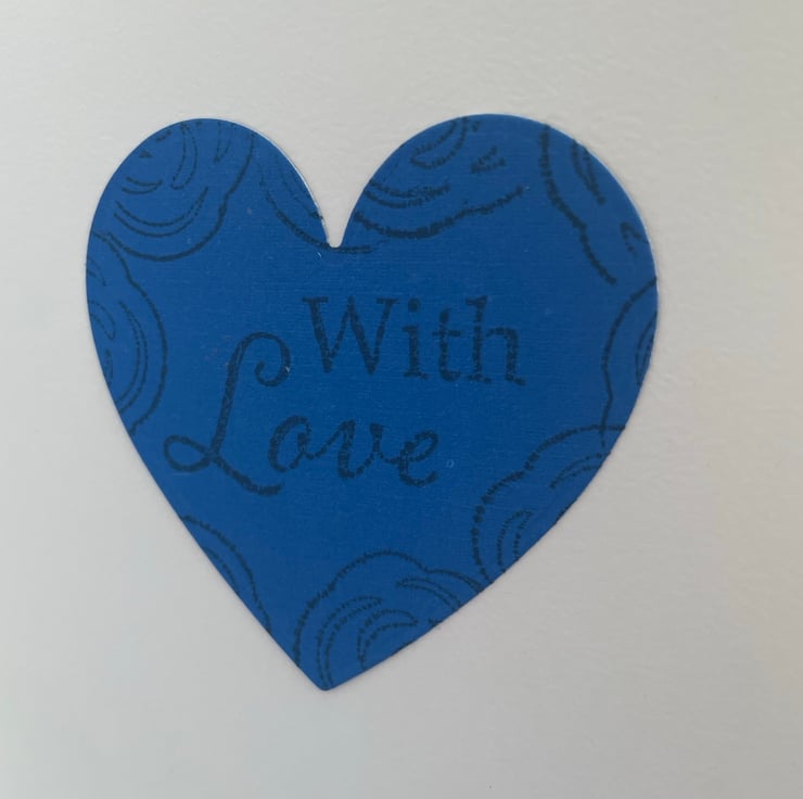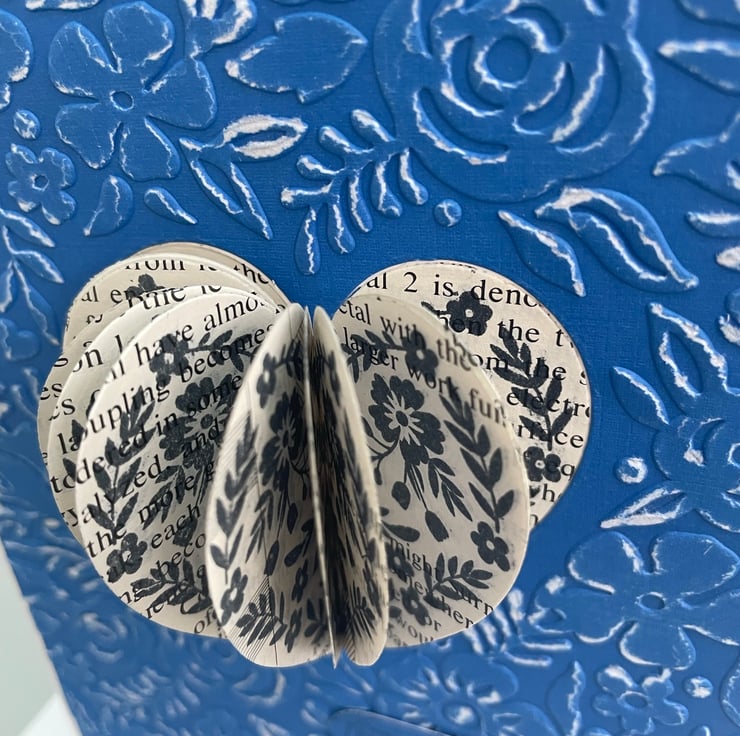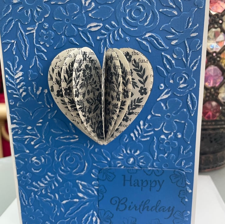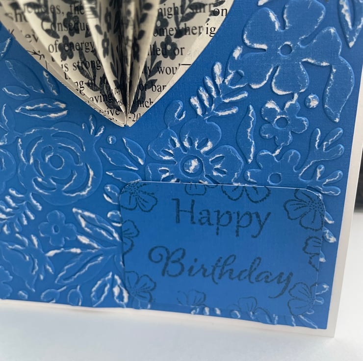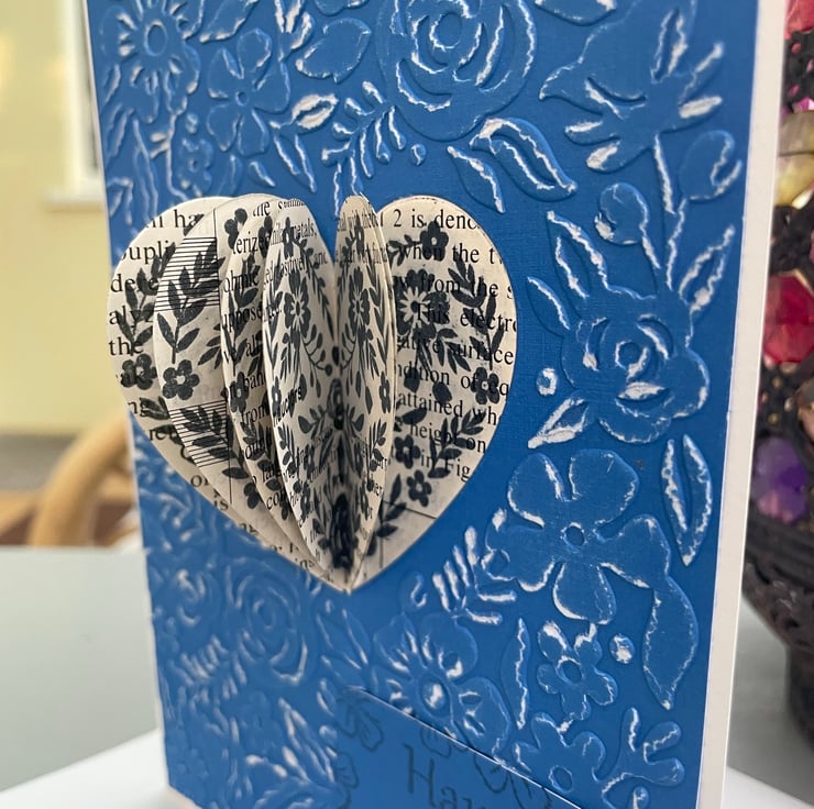 Something a bit different. This A6 size card features a background of bright blue card which is embossed with a folk art inspired pattern and sanded back to show the pattern. There is a heart apature which is filled with a 3D heart made from the pages of an old book. Several matching hearts have been cut out, stamped with a matching folk art pattern and then formed into a 3D shape. The book is an old electronics textbook so a little science to go with the love. The greeting on the front says Happy birthday. Inside the card has the heart from the front apature which has With love stamped on it. A unique way to celebrate a birthday. The card folds completely flat for posting.
