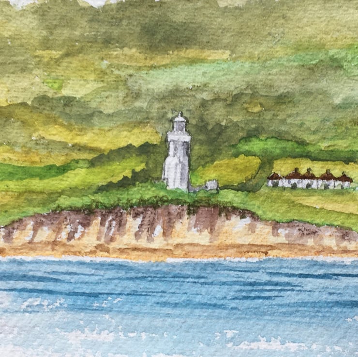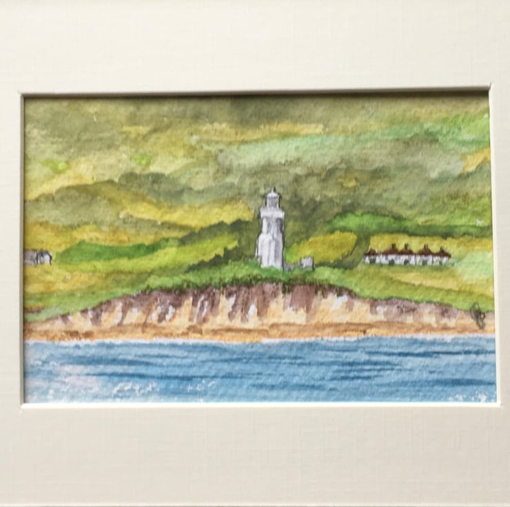 This original painting shows a lighthouse on an island off the coast of France. It is painted on hand made watercolour paper using Artist quality paints and measures 15cm x 10cm approx. It will be sent with a mount, in a cello bag within a sturdy envelope, postage free to UK destinations.