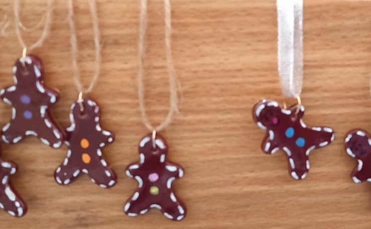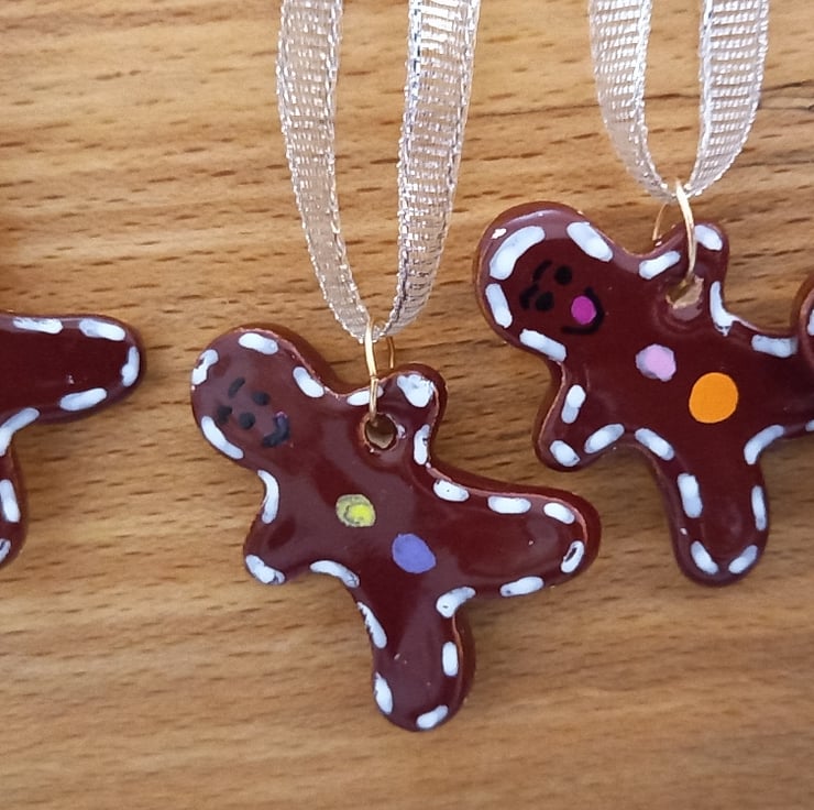Cute mini ceramic gingerbread men made from earthenware clay hand cut bisque fired hand glazed and refired to 1100°c . I've attached copper jump rings so they can dangle nicely on your tree or as a little decoration to your gifts. They can also be added to wreaths,garlands and lots more Christmas decorations, or addition to table settings.
