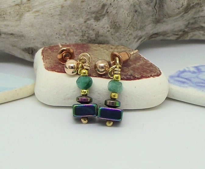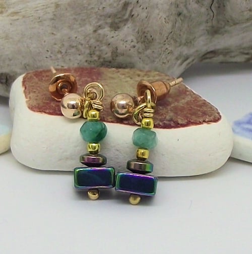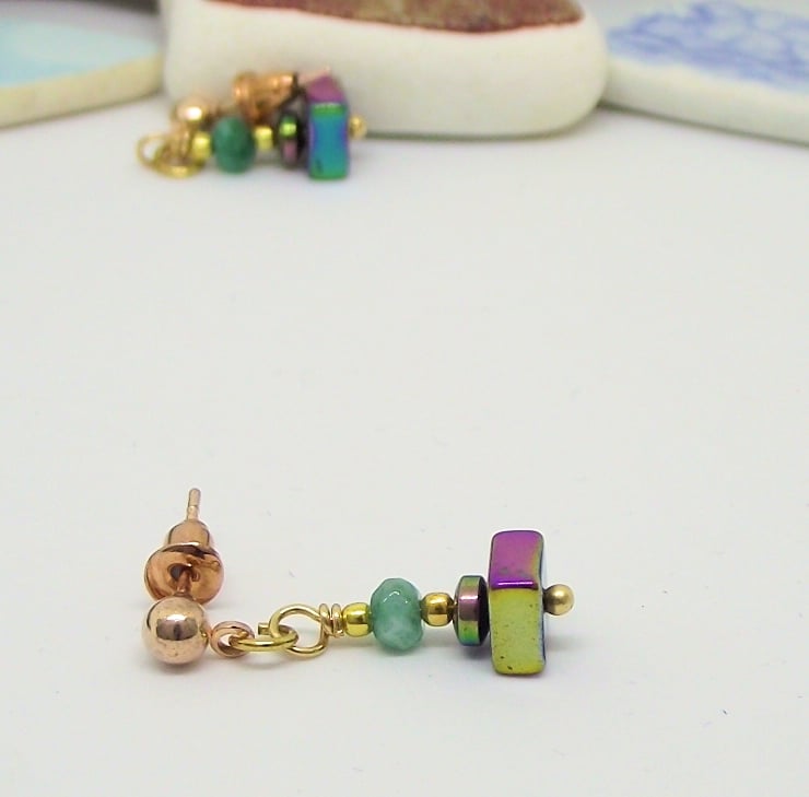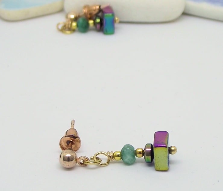 Pretty little rainbow haematite and green faceted jade bead earrings. Rose gold plated stud earring posts. Gold plate accent beads and wire wrap bead post. Earring drop 25mm