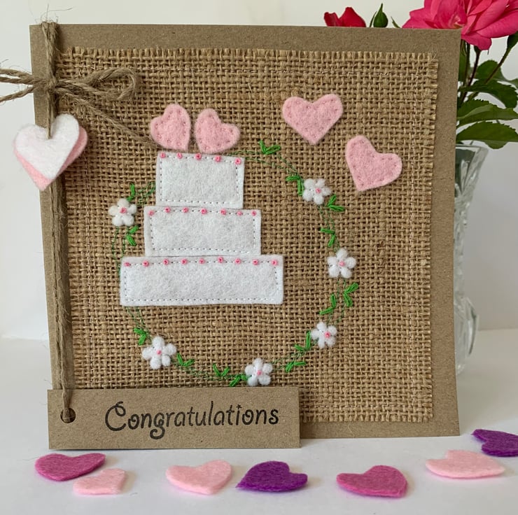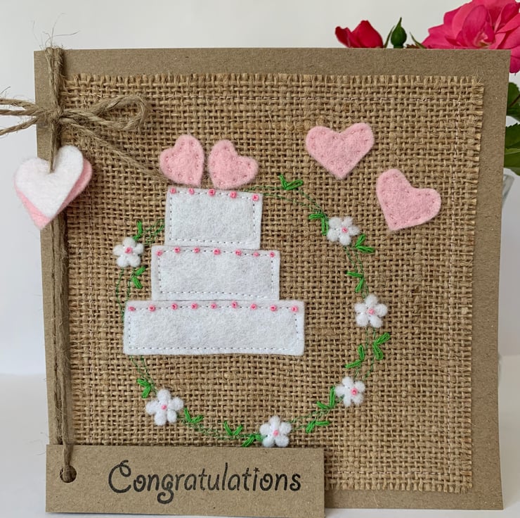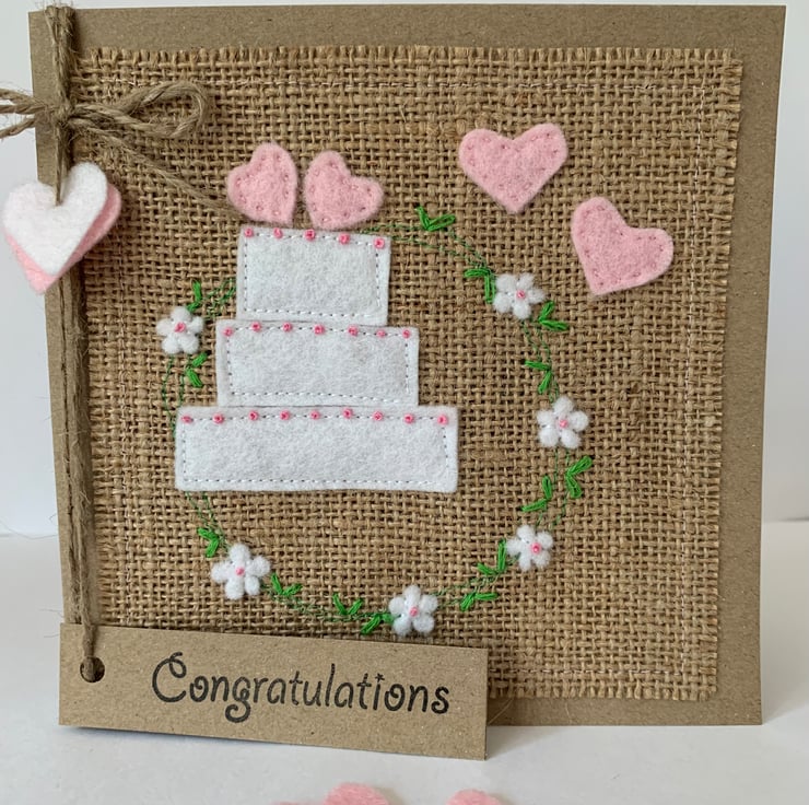 This unique handmade wedding card is decorated with a white wedding cake inside a circle of white flowers with pink centres. Pale pink hearts decorate the top of the cake.