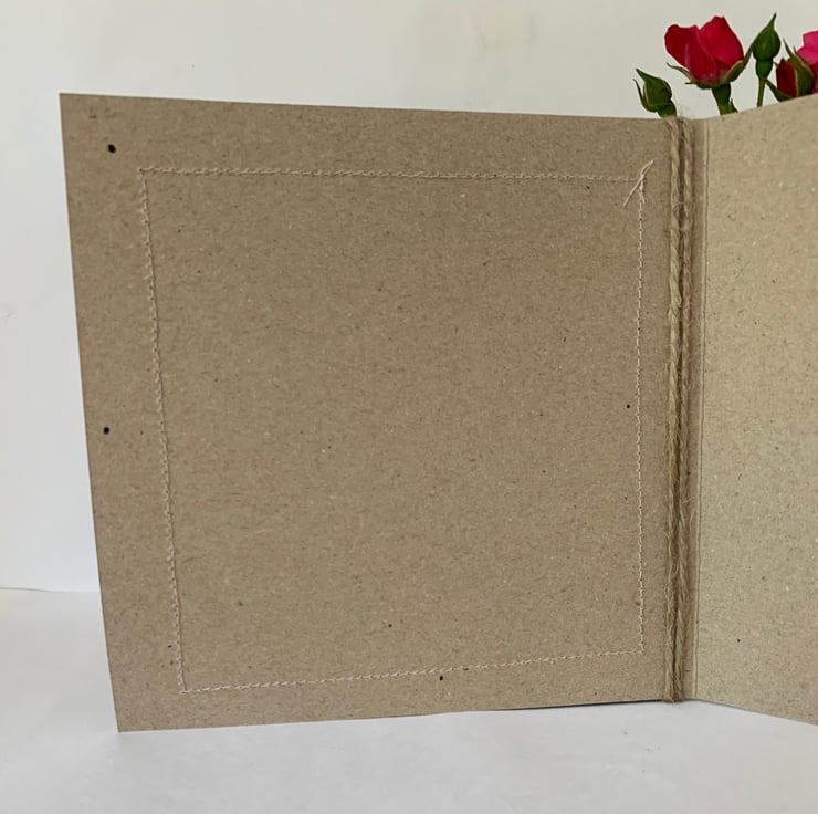 The hessian is machine stitched using a contrasting thread, onto a plain brown recycled card. This stitching is visible on the inside of the card.