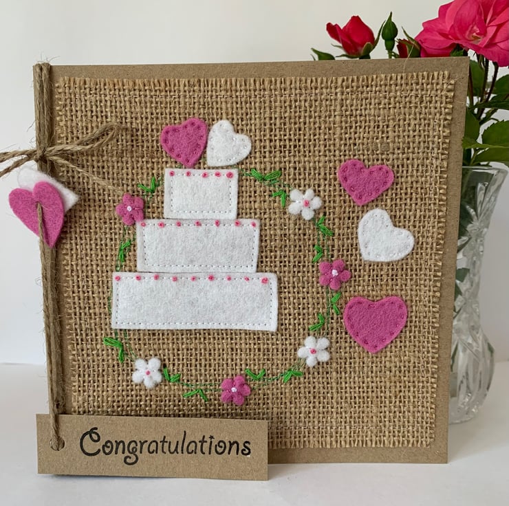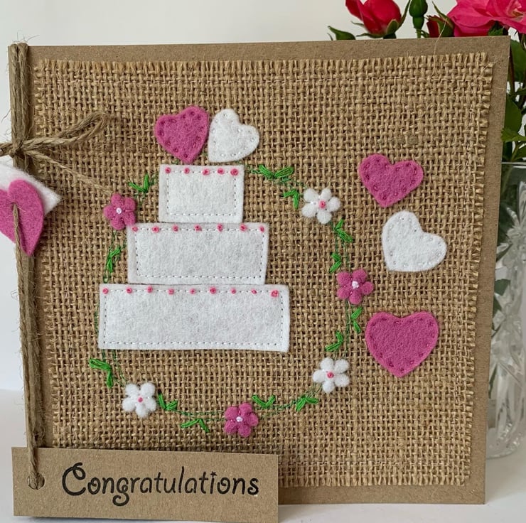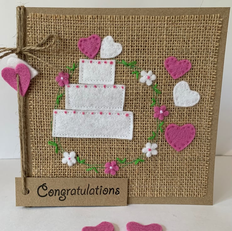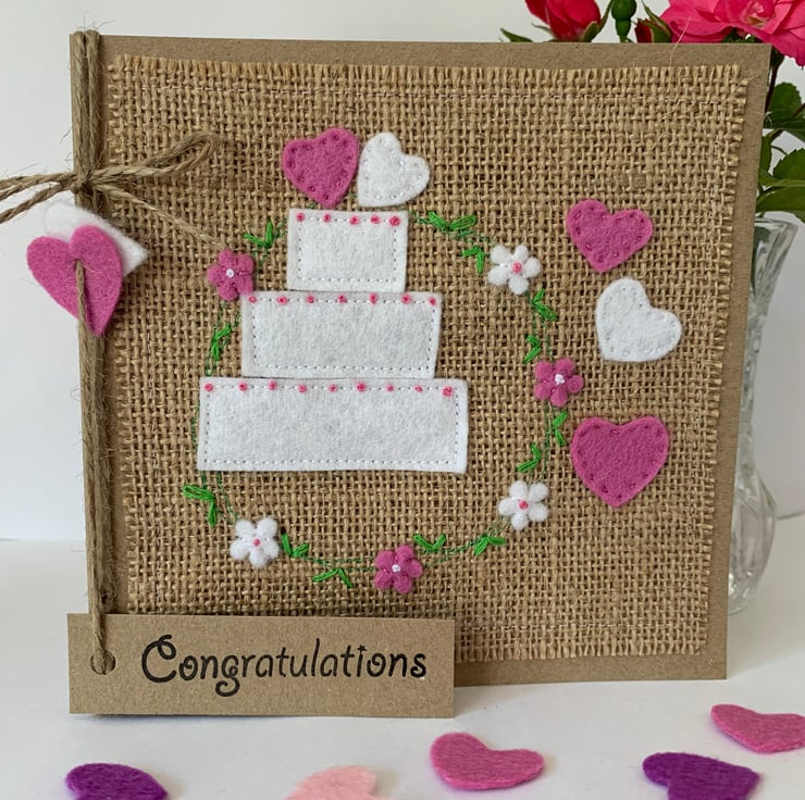 Jute string is wound around the spine of the card and tied in a bow with hearts and congratulations added.
