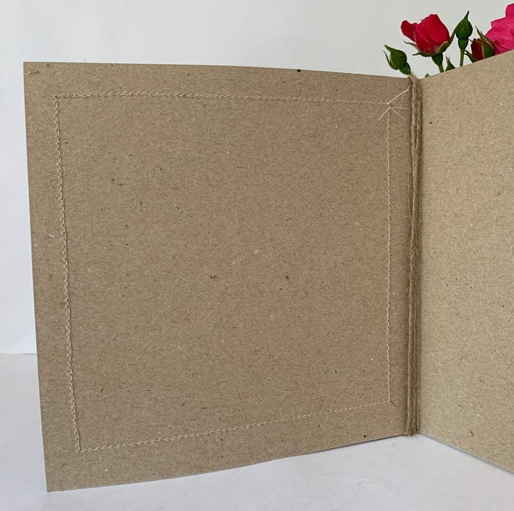 The hessian is machine stitched using a contrasting thread, onto a plain brown recycled card. This stitching is visible on the inside of the card.
