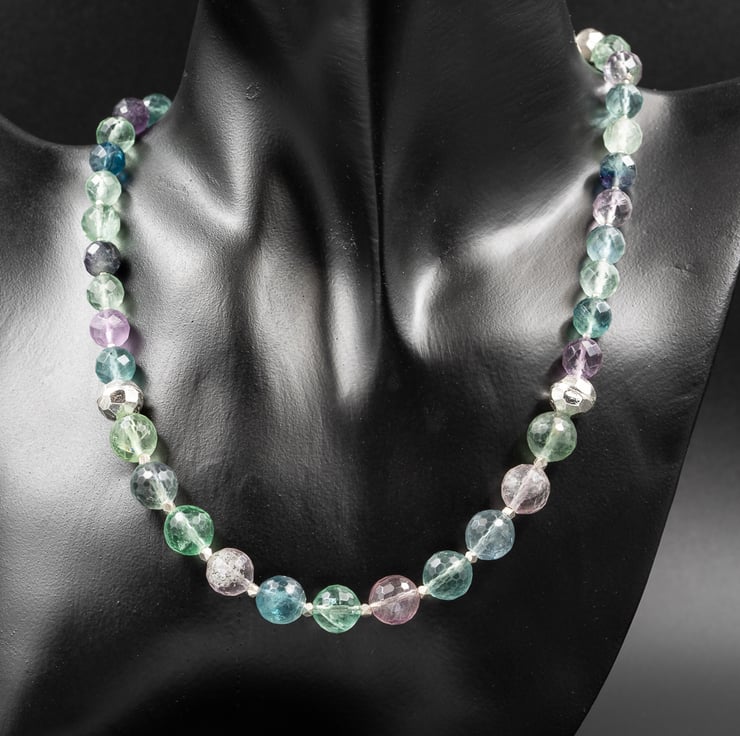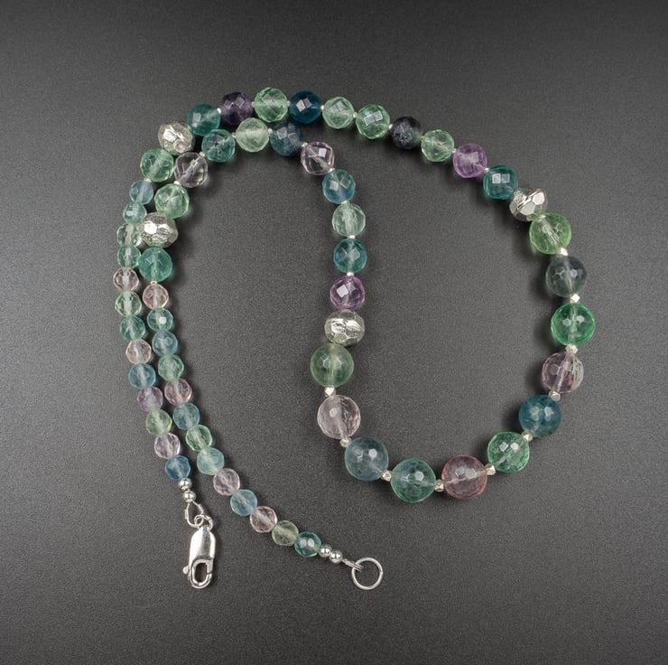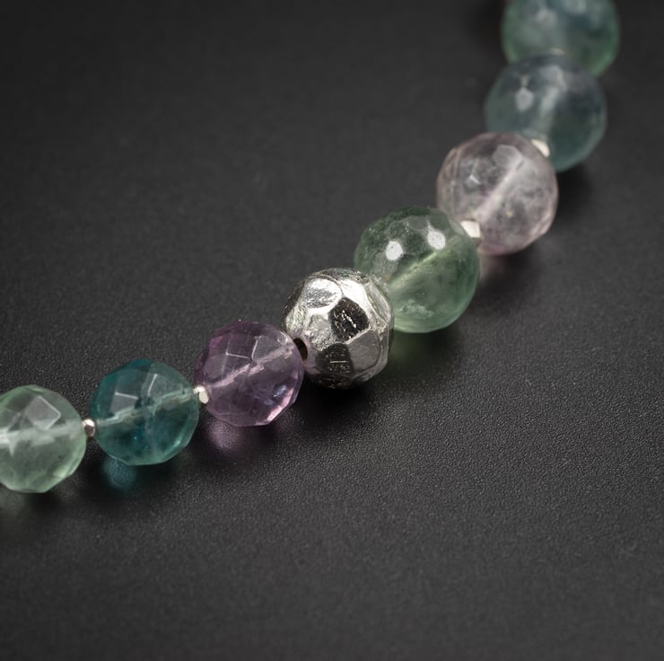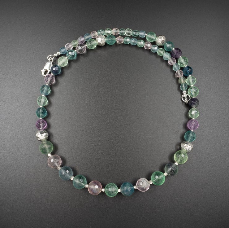 For this design I have used faceted fluorite rounds graduating from 10mm - 6mm separated by faceted Karen Hill tribe Thai silver beads.