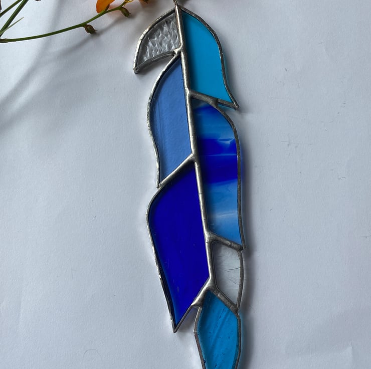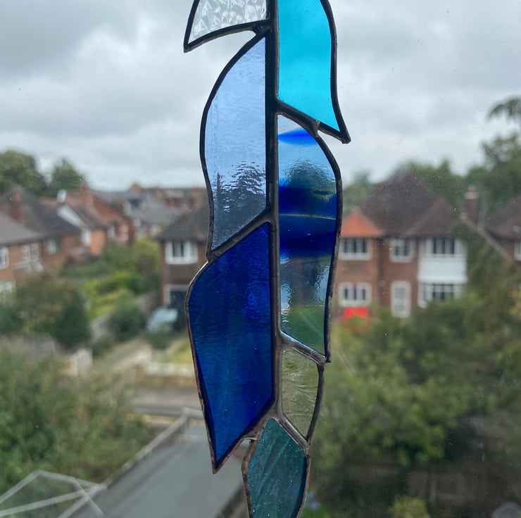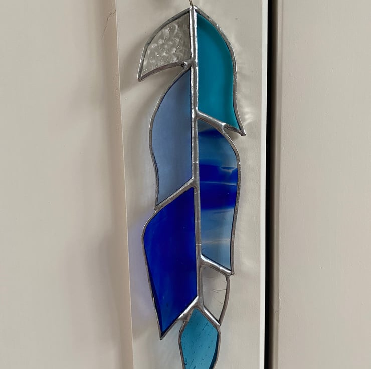 A beautiful blue feather made using the Tiffany (copper foiled) method of stained glass. The feather is made up fo 7 individual pieces of glass in varying shades of blue, each piece of glass also varies in size and texture. The feather is topped with two small silver beads and one larger blue bead at the base of the clear nylon hanging thread.