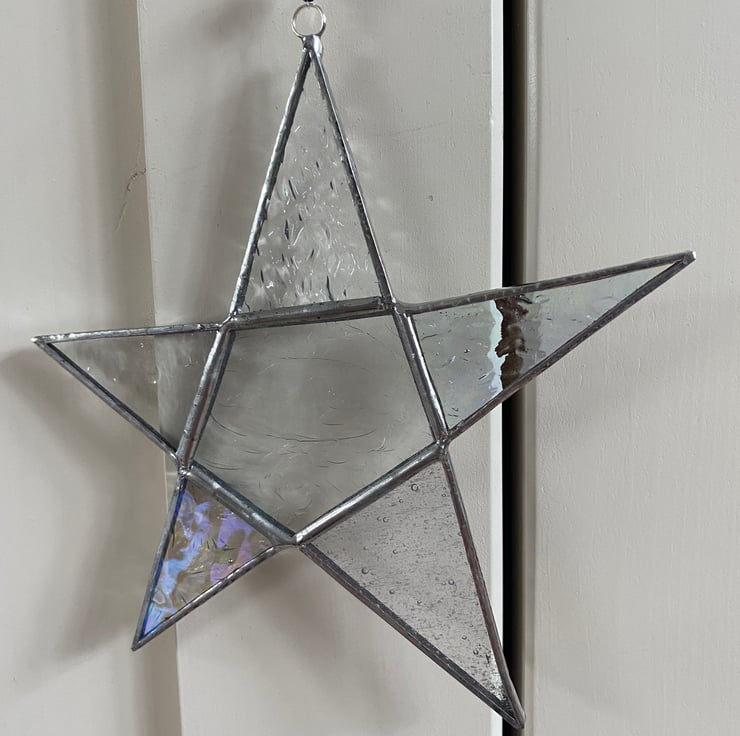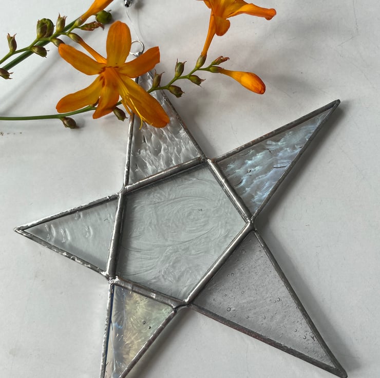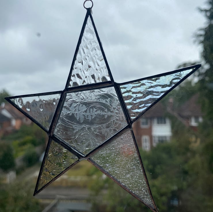 A beautiful 5 point stained glass star made using the Tiffany (copper foiled) method of stained glass. Each piece of glass is a different clear texture and two of the points are in a clear iridescent glass. It has 2 small silver coloured and a clear faceted bead on the clear nylon hanging thread.