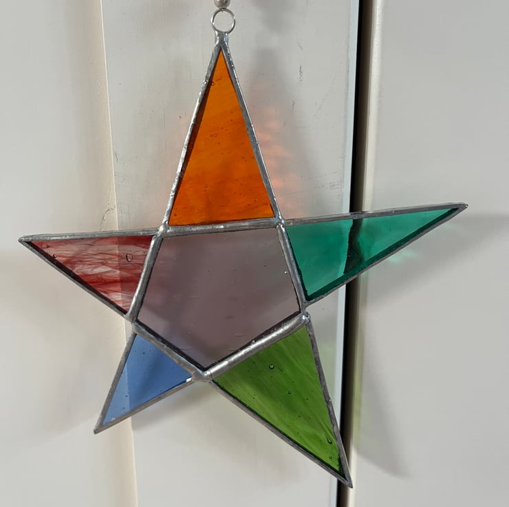 A beautiful 5 point stained glass star made using the Tiffany (copper foiled) method of stained glass. Each piece of glass is a different colour ( orange , red streaky, turquoise, green, purple , blue). It has 2 small silver coloured and an orange bead on the clear nylon hanging thread.
