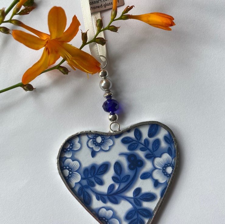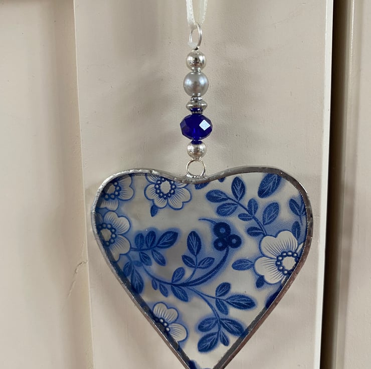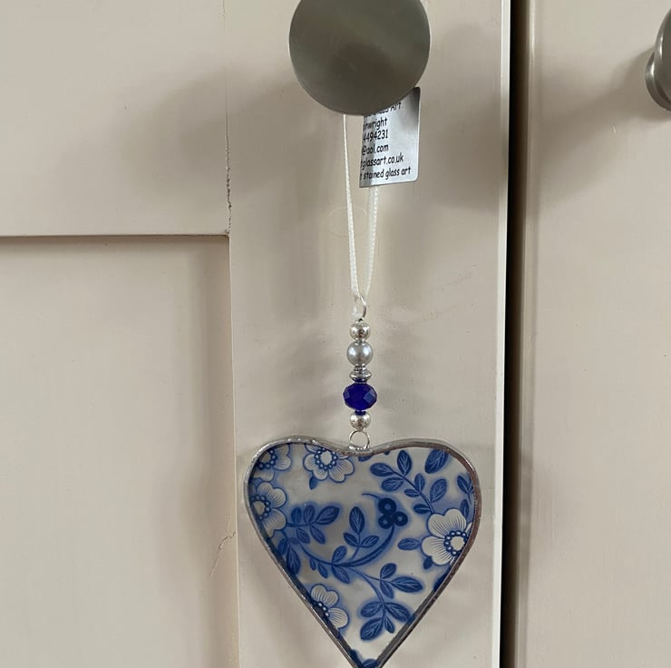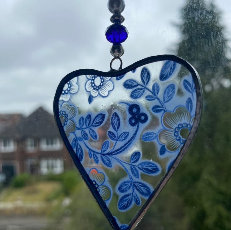 A beautiful stained glass heart made using the Tiffany (copper foiled) method of stained glass. It has been made using a lovely blue flowery glass.