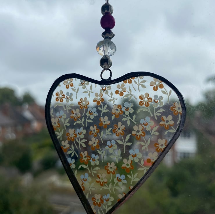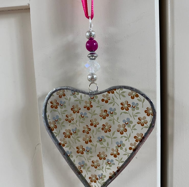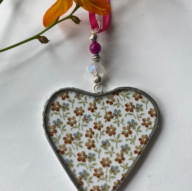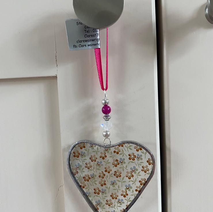 A beautiful stained glass heart made using the Tiffany (copper foiled) method of stained glass. It has been made using a lovely blue, pink and green flowery glass.
